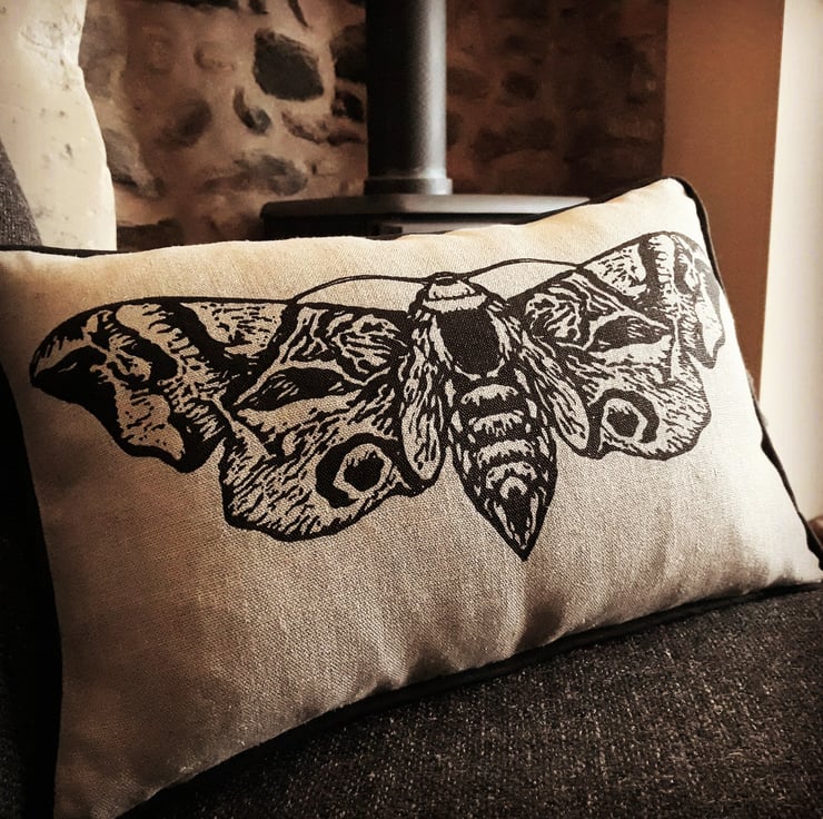 A handprinted natural linen cushion in my Hawkmoth design.