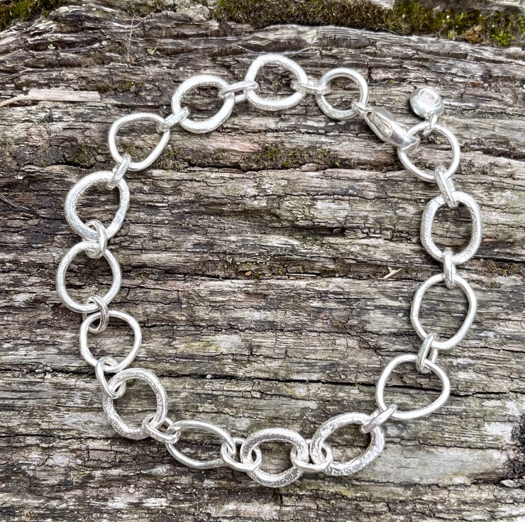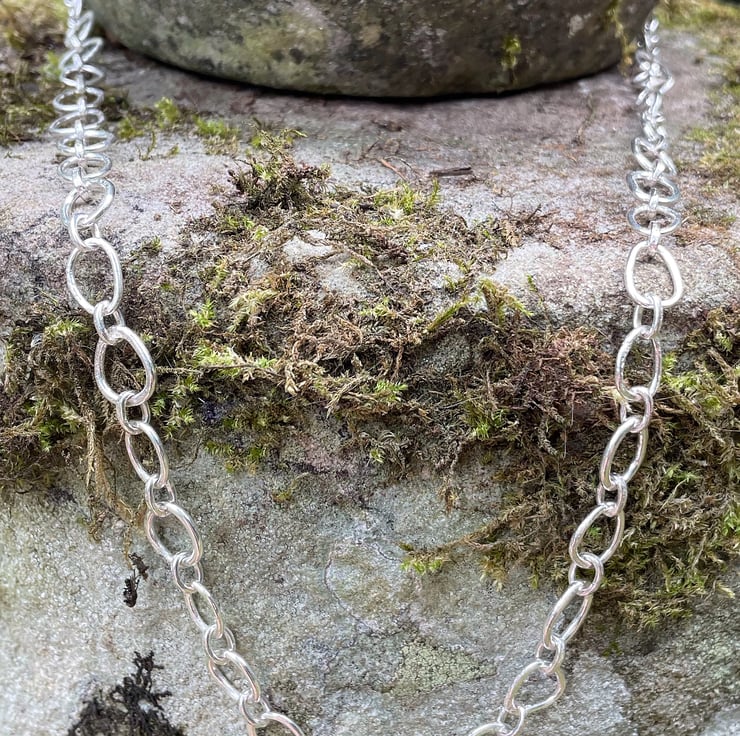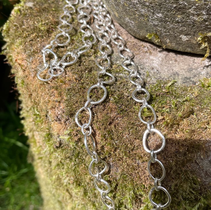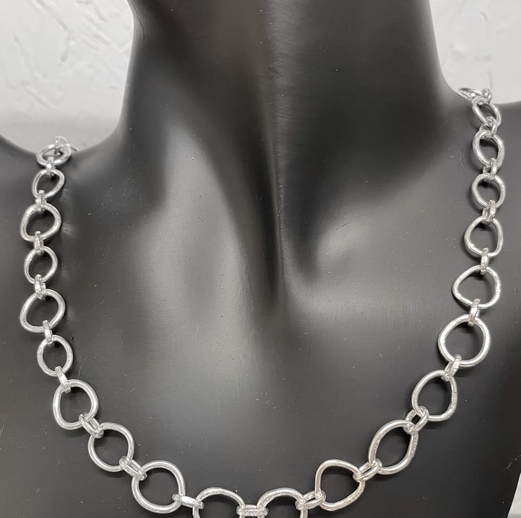 The necklace links are lightly textured, and have been burnished to a bright shine.