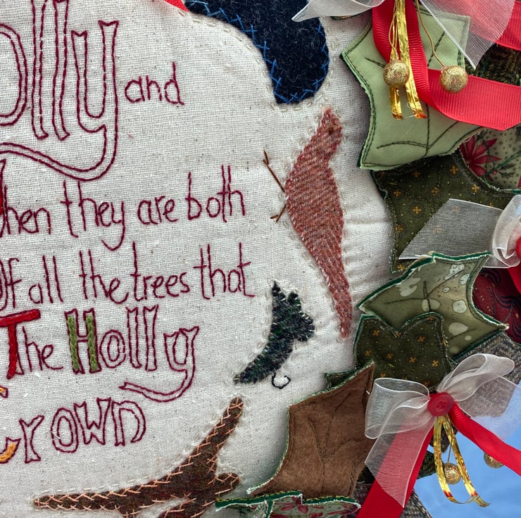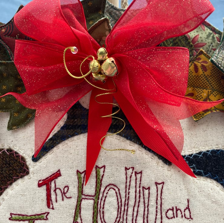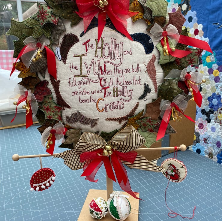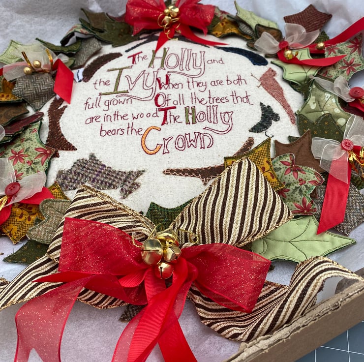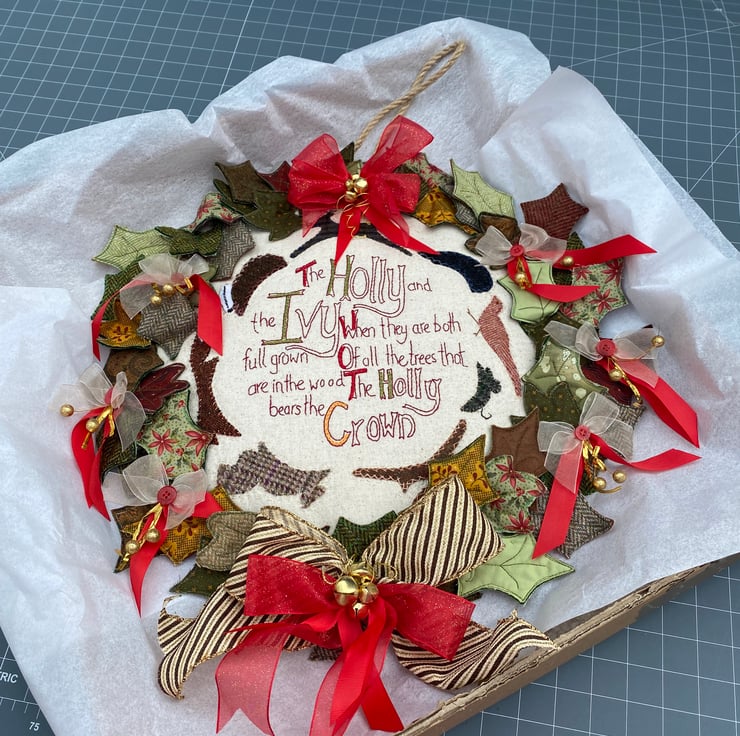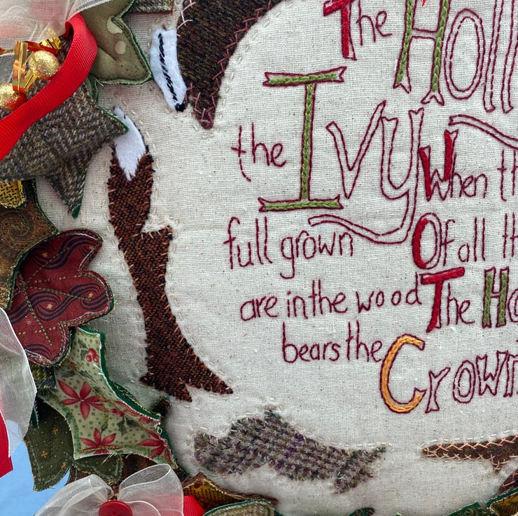 A nice new Festive Wreath for your Christmas display in your home, shop, school, workroom etc. Anywhere you need a traditional, country, rustic look, with tweed and quilting cotton woodland animals, holly leaves and ivy leaves in raw-edged appliqué.