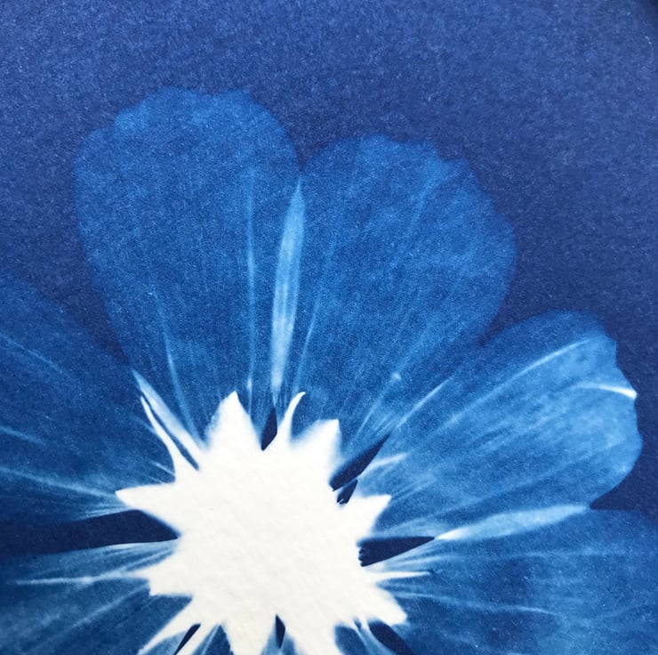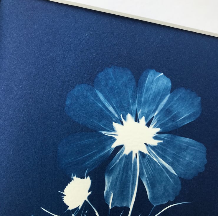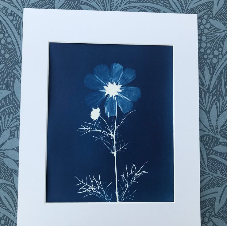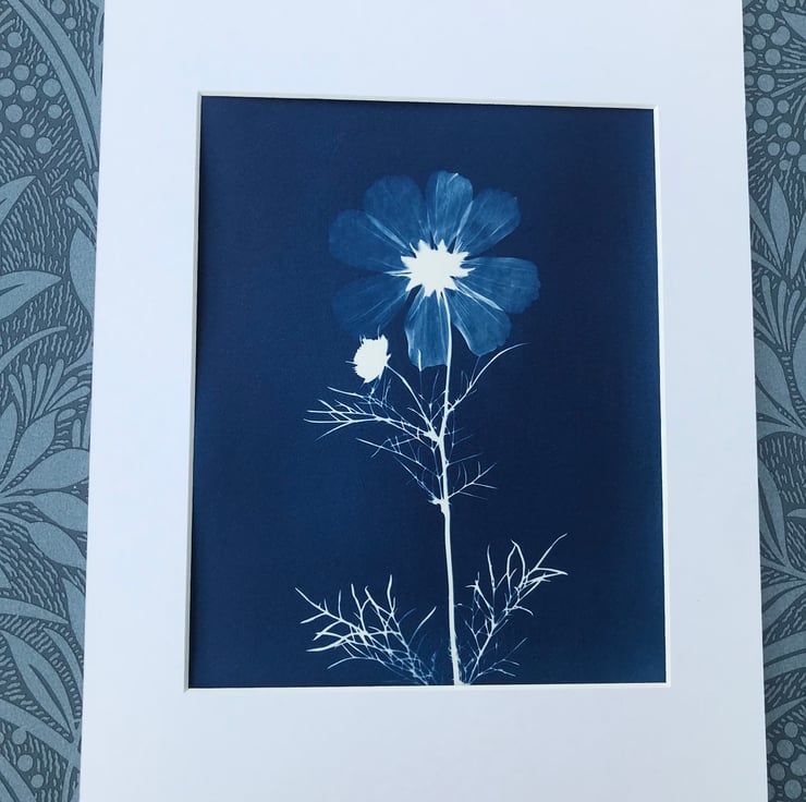 October Birthday Flower. This Traditional Cyanotype was made using a home-grown white Cosmos flower, which I pressed before laying on the light-sensitive paper ready for exposure.