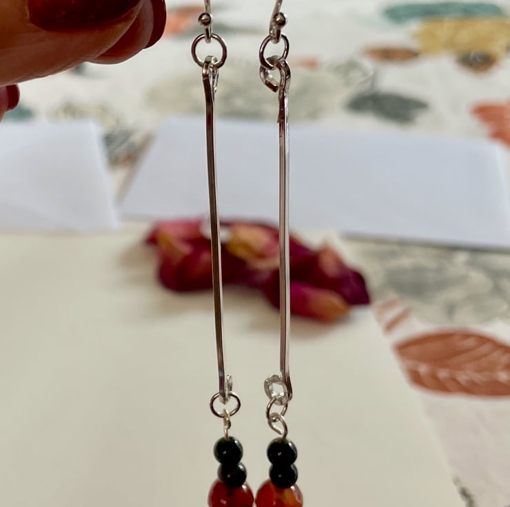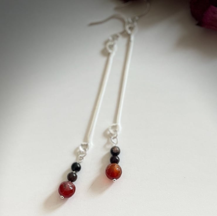 Statement earrings. Made and forged by hand, with 925 sterling silver, tourmaline and orange faceted agate. I made a long silver bar to add length and elegance and then added the stones to the bottom and ear wires to the top.