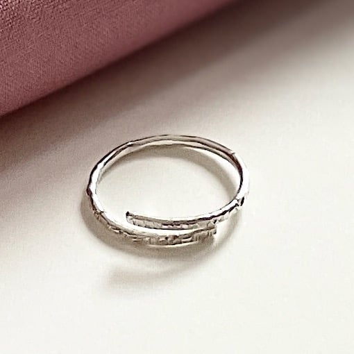 Delicate silver wraparound ring. Cut, forged and hammered with a bark pattern (to match the winter driftwood earrings). Made with solid 925 sterling silver, 1.3mm wide. Medium size, to fit most ring sizes, adaptable.