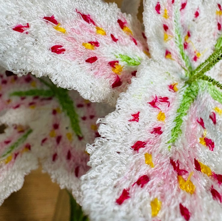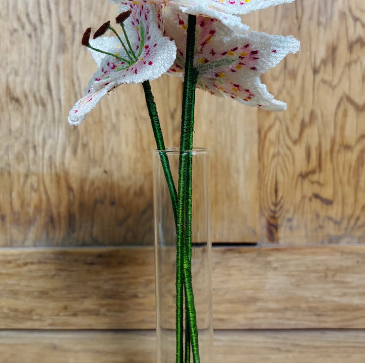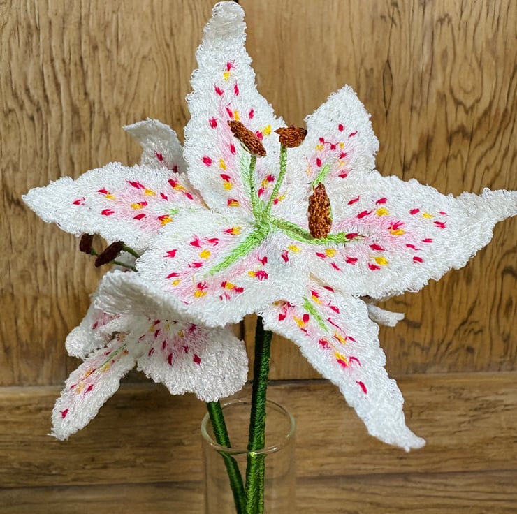 Handmade using freehand machine embroidery on water-soluble fabric, this lily brings elegance and purity. A symbol of renewal and devotion, it is recognised as the national flower of Italy. Unlike real lilies, it’s completely pet friendly, safe for every home and forever in bloom.