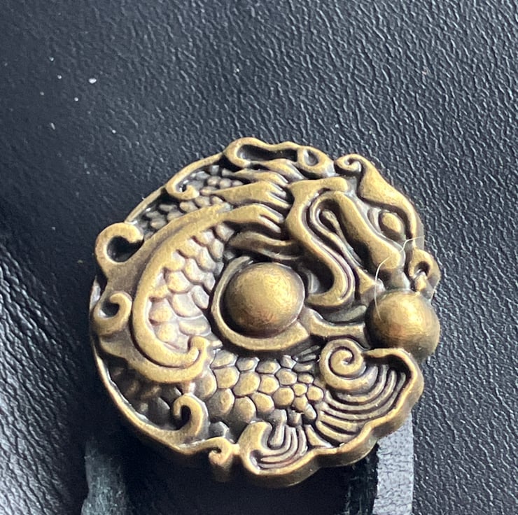 Dimensions: 7" wide, 5 1/2-6" in height, gusset is 1 1/2" wide. Belt loop on back will fit up to a 3" wide belt. Leather weight is 2-3 oz. Handstitched with black leather lacing. Dragon Concho is screwed into the leather (it's not falling out) - close up of concho as last photo.