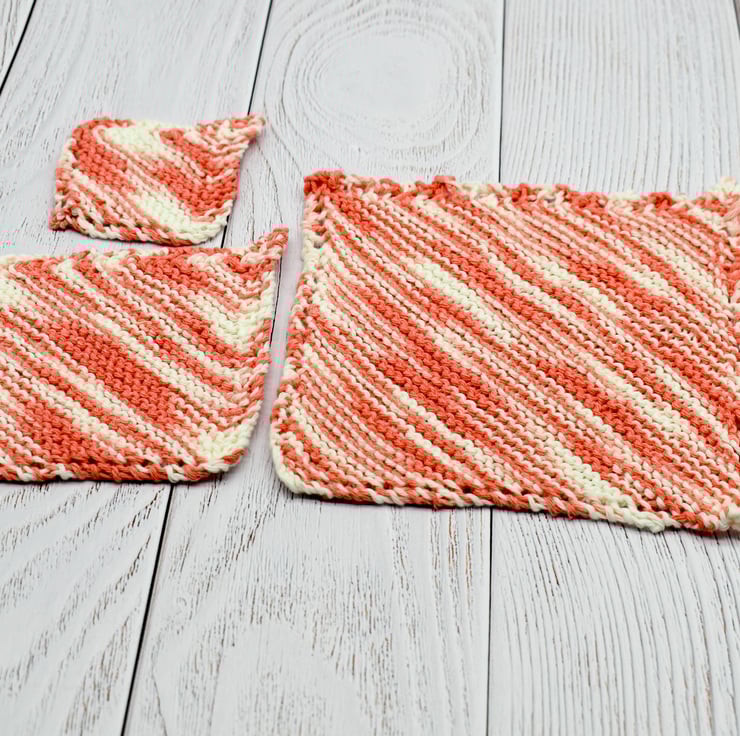 Hand knitted cotton wash cloths are great for all sorts of tasks. Much better to ditch the wipes and switch to these reusable cloths for washing your face and body. This pack of three cloths are each different sizes, with the larger size having a handy hanging loop;