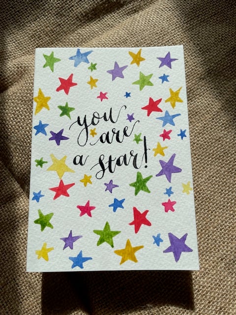Fun watercolour card with message " You are the star" truly unique and there is no other. The card features delicate watercolours and hand-drawn calligraphy, making each card a one-of-a-kind piece of art. No card is ever the same.
