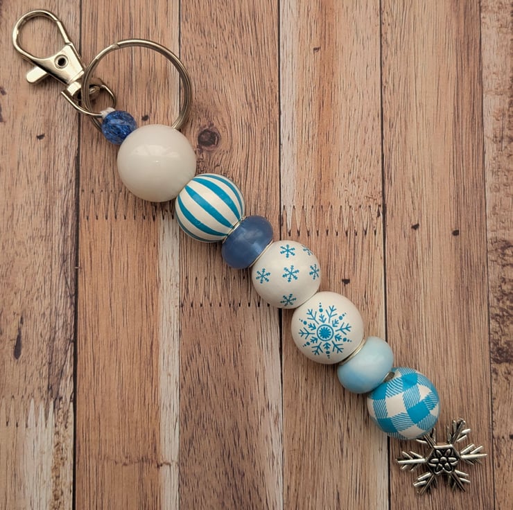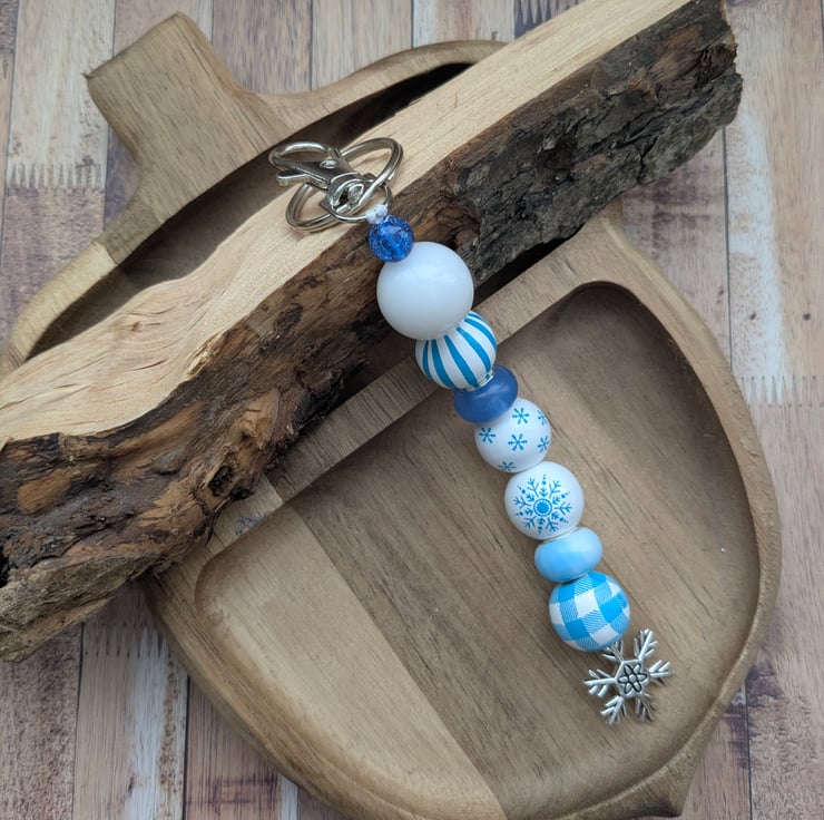 The beads used are white and blue and feature snowflakes and other winter patterns at the bottom of the key ring is a Tibetan silver snowflake charm.
