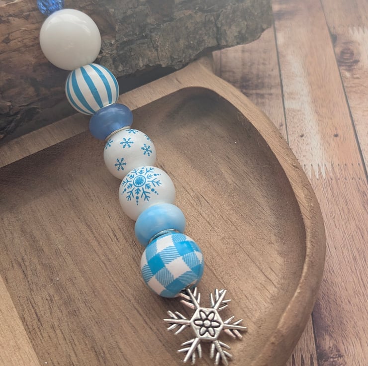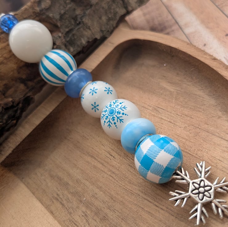 This cute little snowflake accessory is great for your handbag or for a zipper and has many other uses. It is around 6 inches in length and is made from a variety of wooden and acrylic beads.