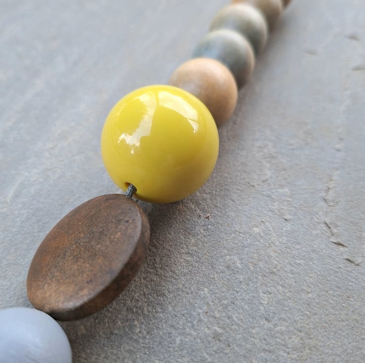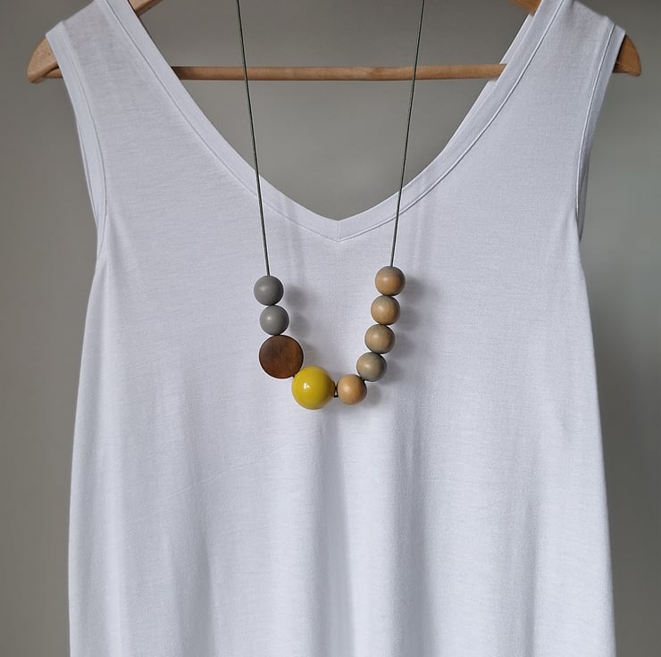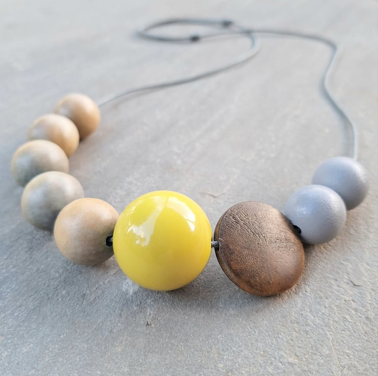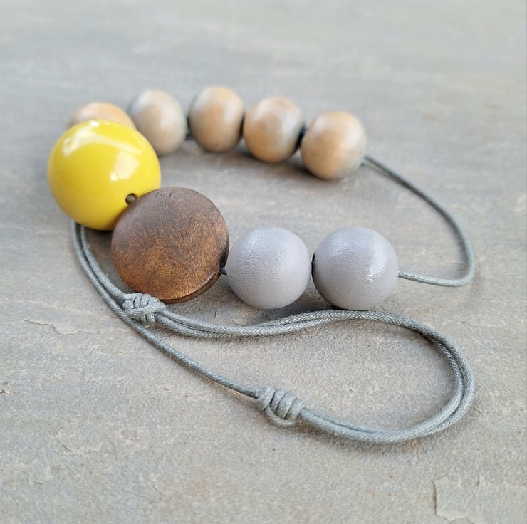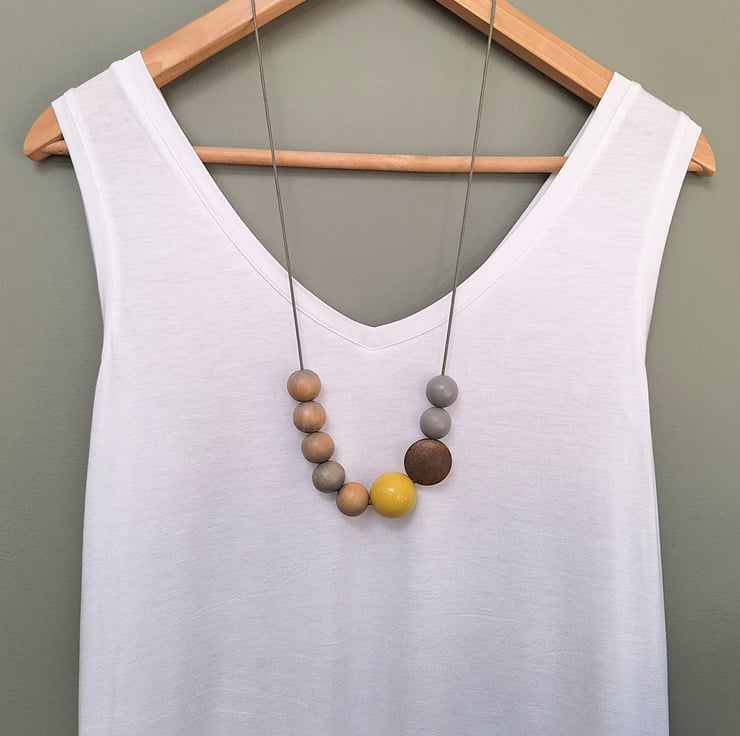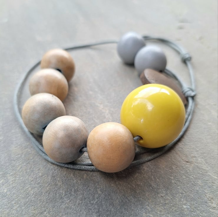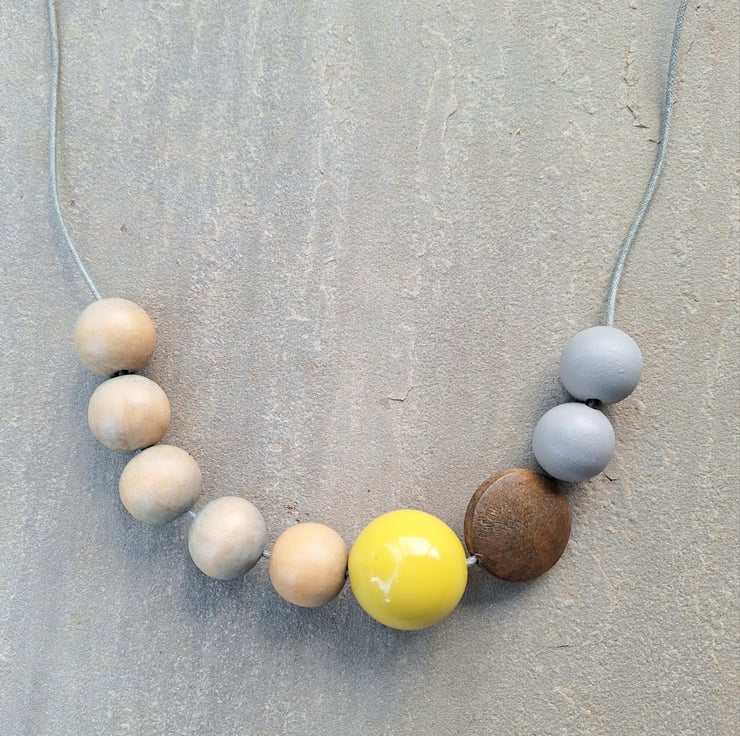 Nutmeg - A wooden beaded necklace with one large recycled ceramic canary yellow bead to set it off. The necklace is very light to wear and the length can be changed using the sliding knots. I also added a lovely vintage button bead.