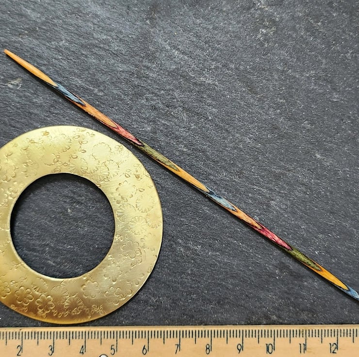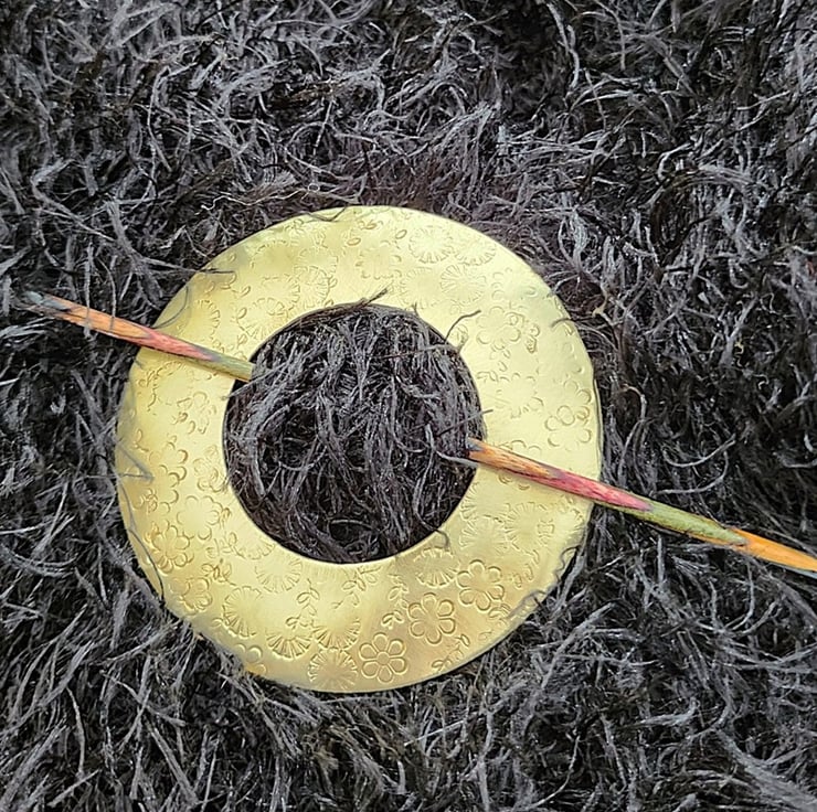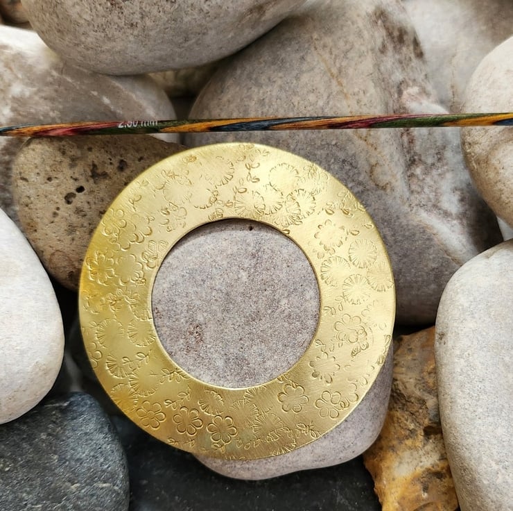 A circular brass shawl pin, imprinted with a textured random daisy effect design. There are also a few butterflies to be found amongst the flowers too. Slightly domed and 6.2cms across. The 15cms pin is multi-coloured wood.