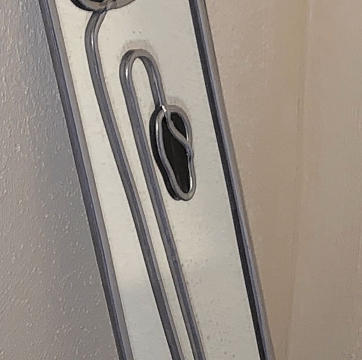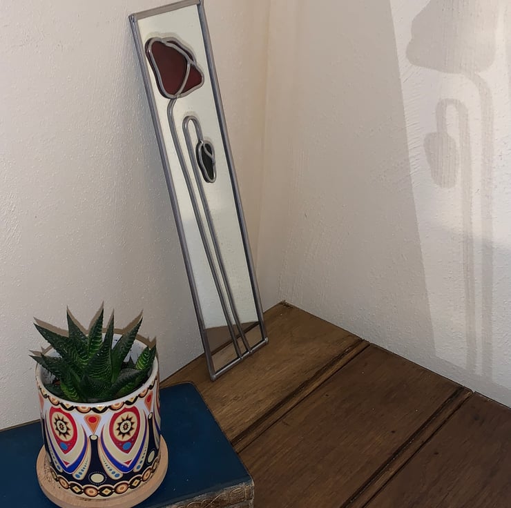 This beautiful, slim, small lead mirror with poppy design measures 30cm long by 8cm wide.