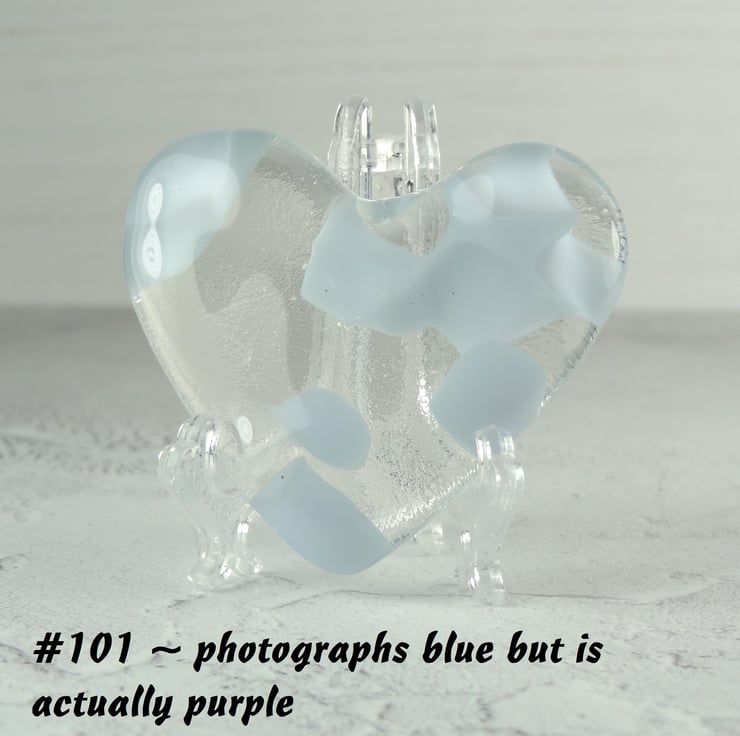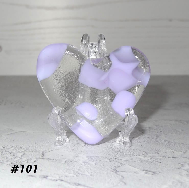 Each heart comes with an acrylic stand, perfect for displaying on a windowsill or shelf. The hearts have a flat back.