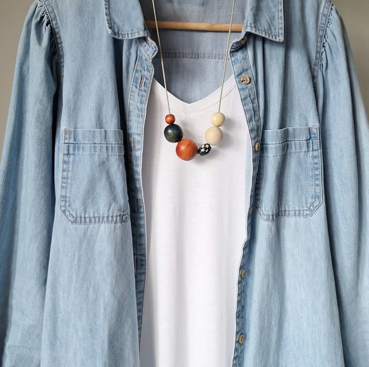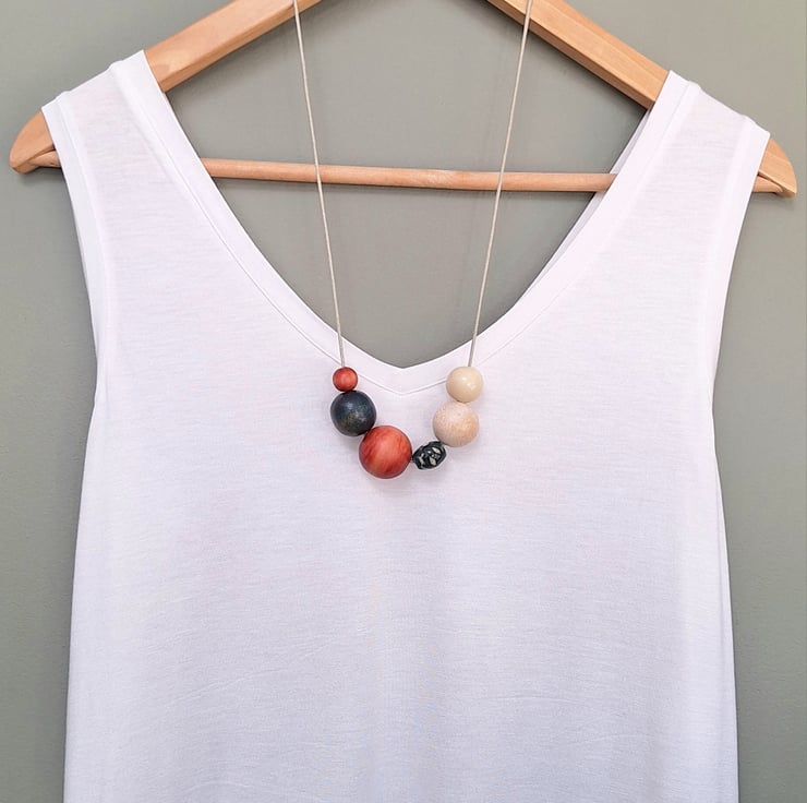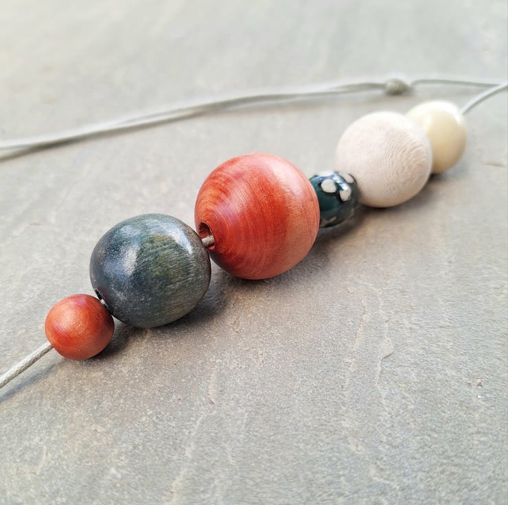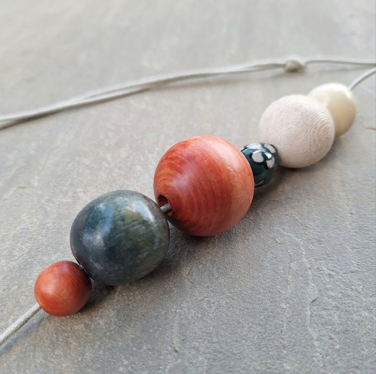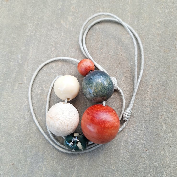 Meg - A lovely small chunky necklace in burnt orange, petrol blue and cream. Most of the beads have been recycled and a small ceramic flower bead added to finish it off. All threaded onto a natural coloured cord with sliding knots.