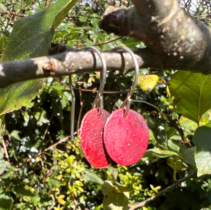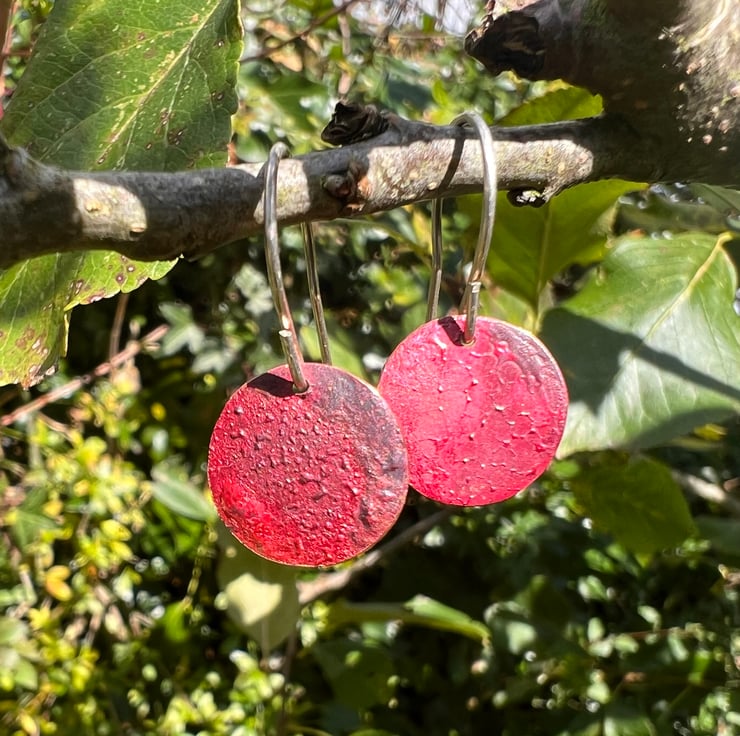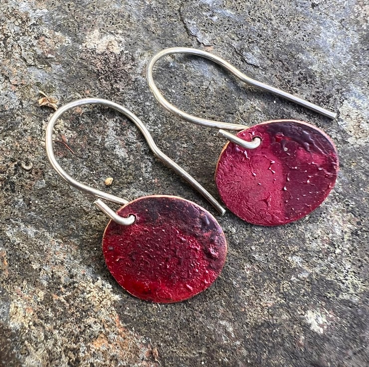 I have cut out copper discs of diameter 12mm/ half an inch and given them a luscious red, purple, slightly textured surface, using heat .