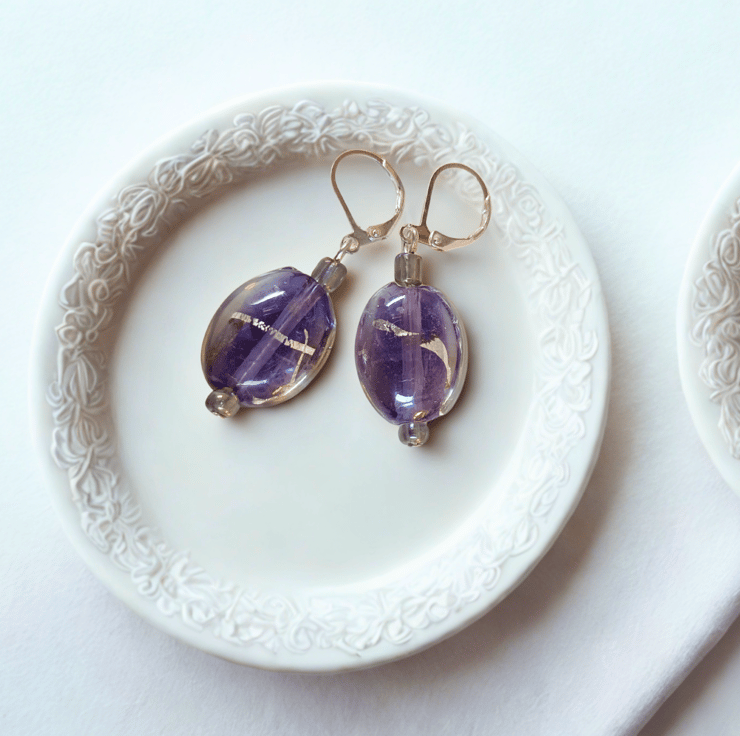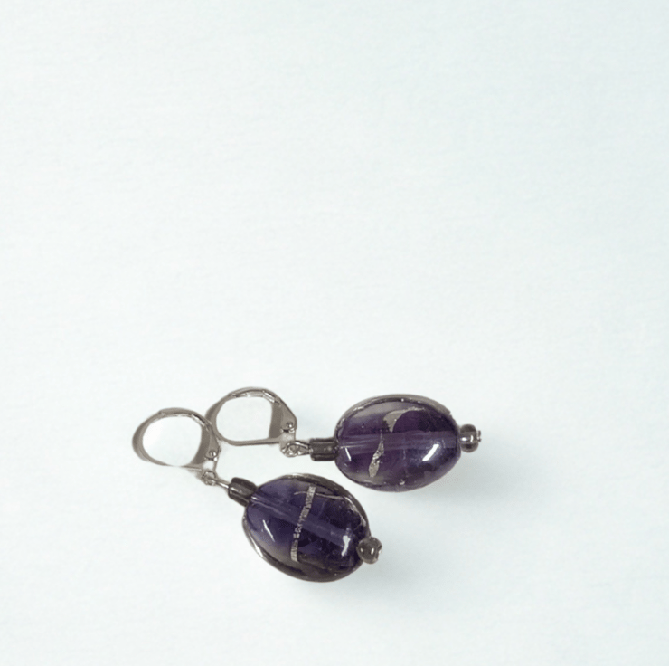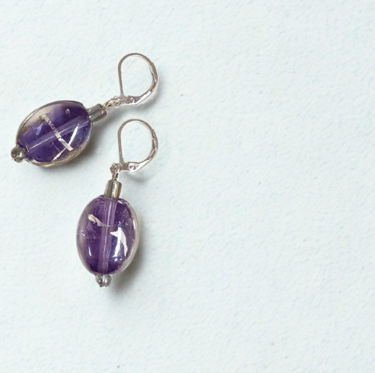 Recycled lavender lampwork beads with silver swirls inside and across the beads. Combined with tiny shimmery white glass beads. On nickel free 925 silver lever back hooks. In a separate listing there is a lovely necklace that matches with these earrings..