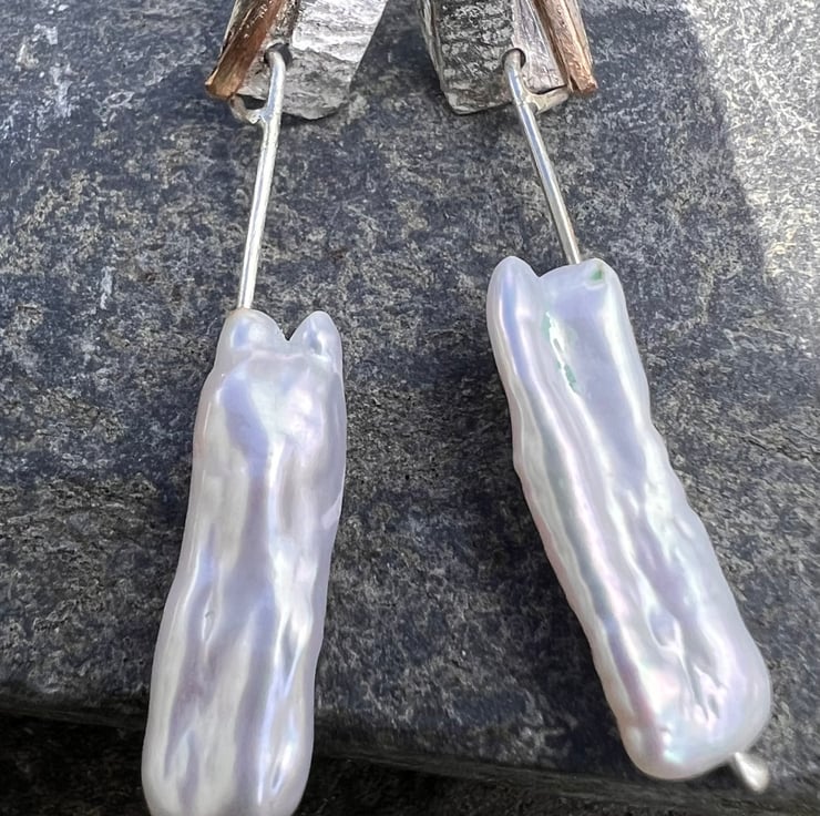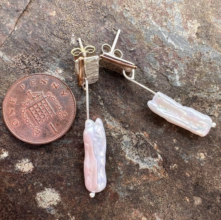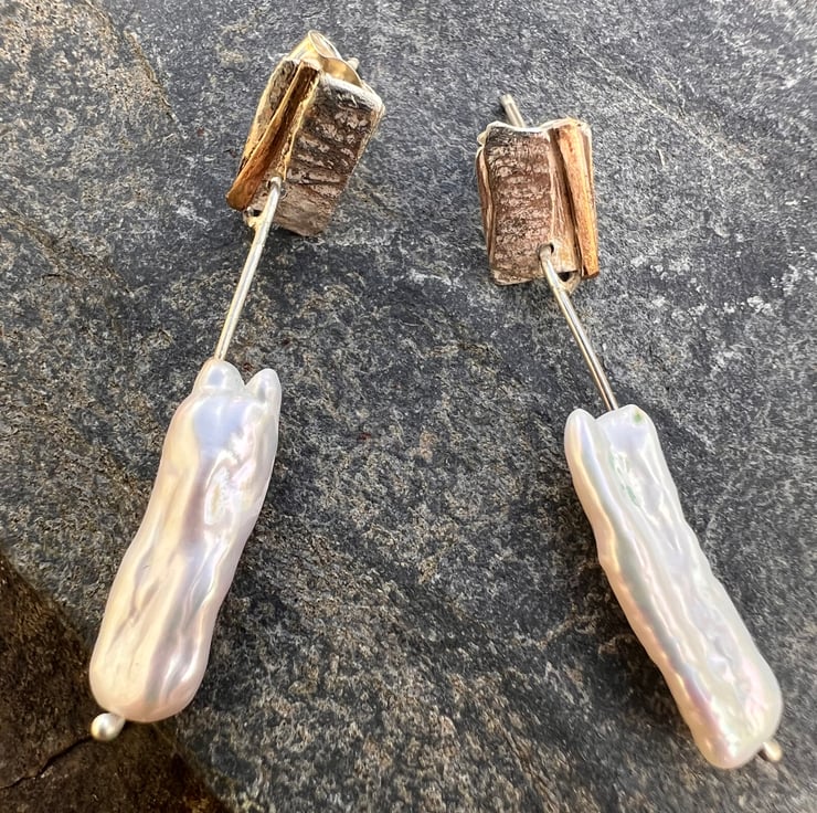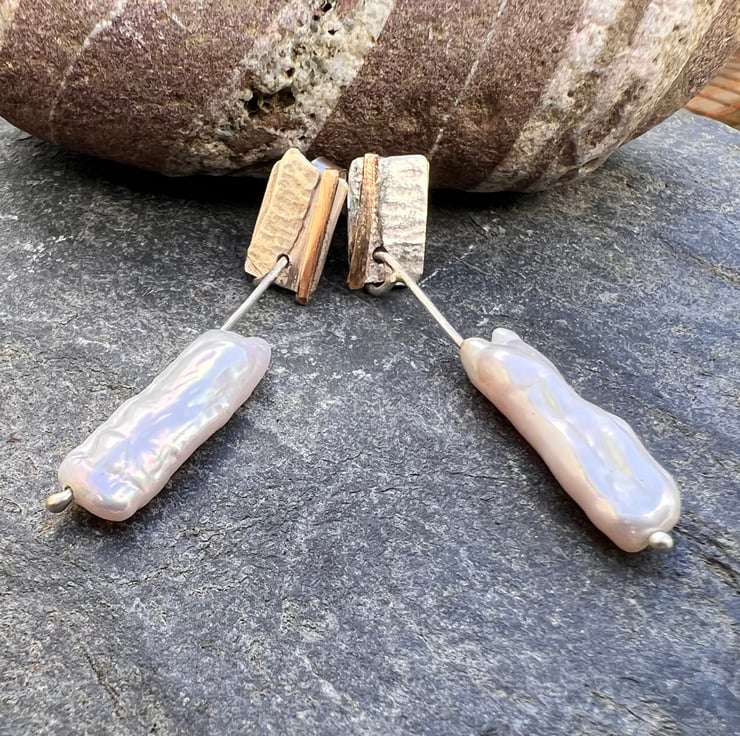 Silver and gold earrings with a biwa freshwater pearl drop, inspired by the coastline. The silver piece has textured detail and a strip of gold filled wire, which is more durable than gold plated.