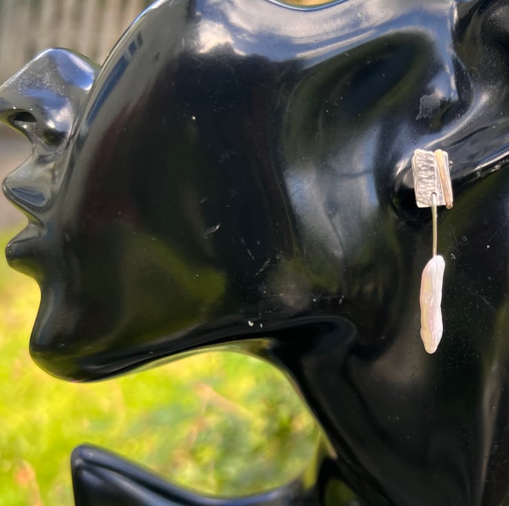 The silver piece , measuring 10mm x 7mm , sits neatly on the ear with a sterling silver earpost and scroll back fastening . The biwa pearl, the textures of which coordinate well with the silver piece , dangle freely on a piece of silver wire , with a soldered loop.