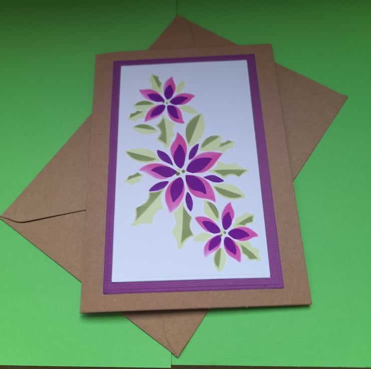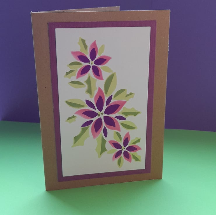 This bright, contemporary design features Poinsettia in purple and pink, complemented by lime and olive green Holly leaves. Mounted on a matching layer mat on a recycled kraft card base.