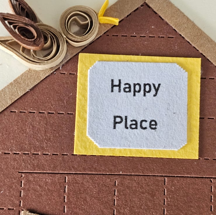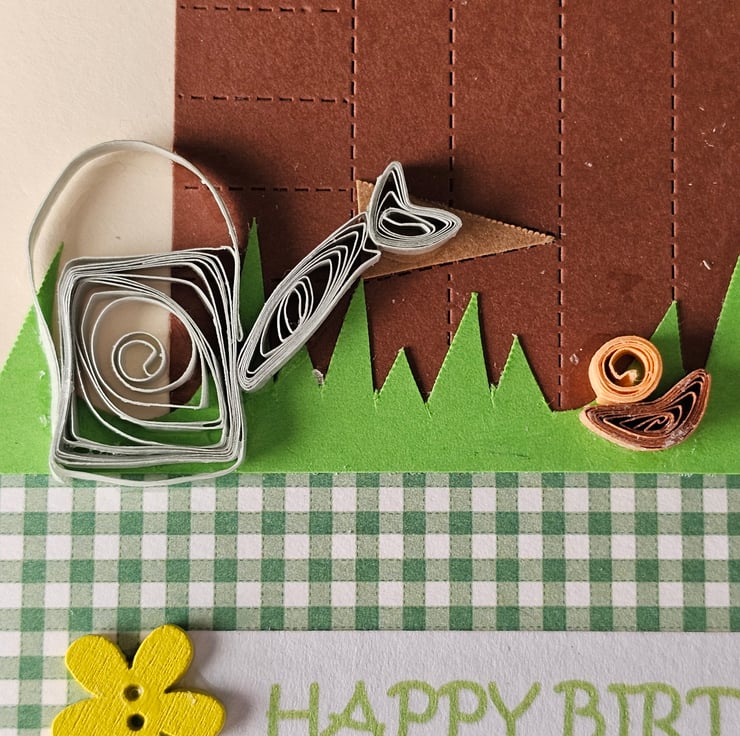 It is made using a cream card and paper as well as two buttons: a flower shaped button next to the greeting and a tiny one for the door handle. I have added a quilled watering can, a quilled sunflower in a pot, a tiny quilled snail and a quilled bird. These are made using 3mm strips of coloured paper.