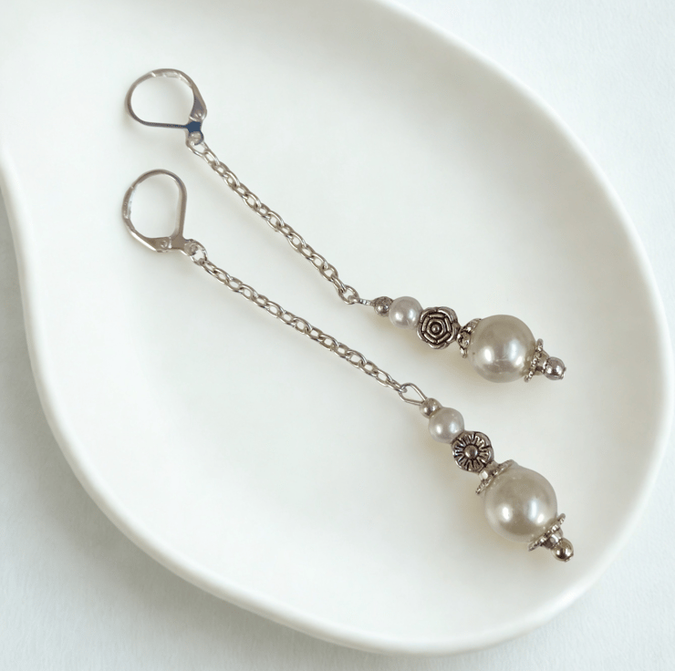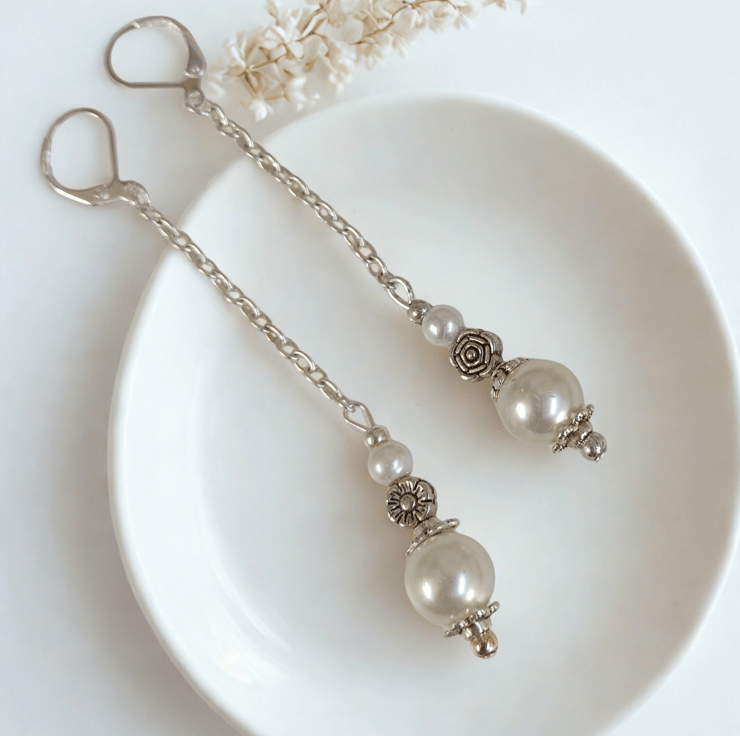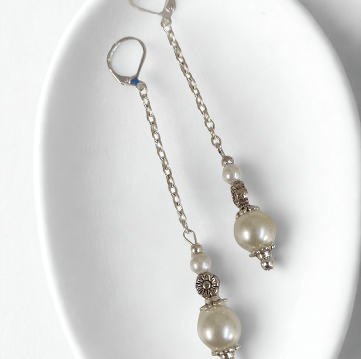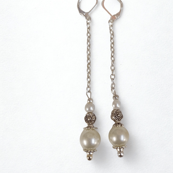 Ivory pearls encased Tibetan silver decorative flower halves with a tiny Tibetan silver daisy bead. Pretty earrings, elegant for a bride on her special day. On 925 silver chains with nickel free 925 silver lever back hooks.