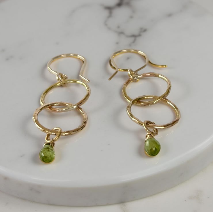 Sustainable artisan jewellery by SilverLines Jewellery. These 14ct gold filled interlinking hoops with a hammered finish and a radiant peridot gemstone blend bohemian charm with timeless eco-luxury. Handmade in Woolacombe, North Devon, 5cm drop.