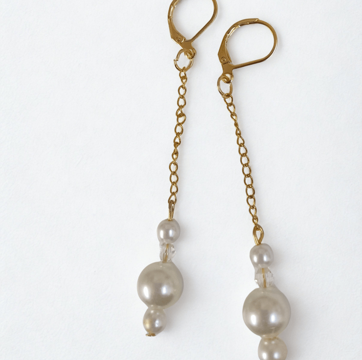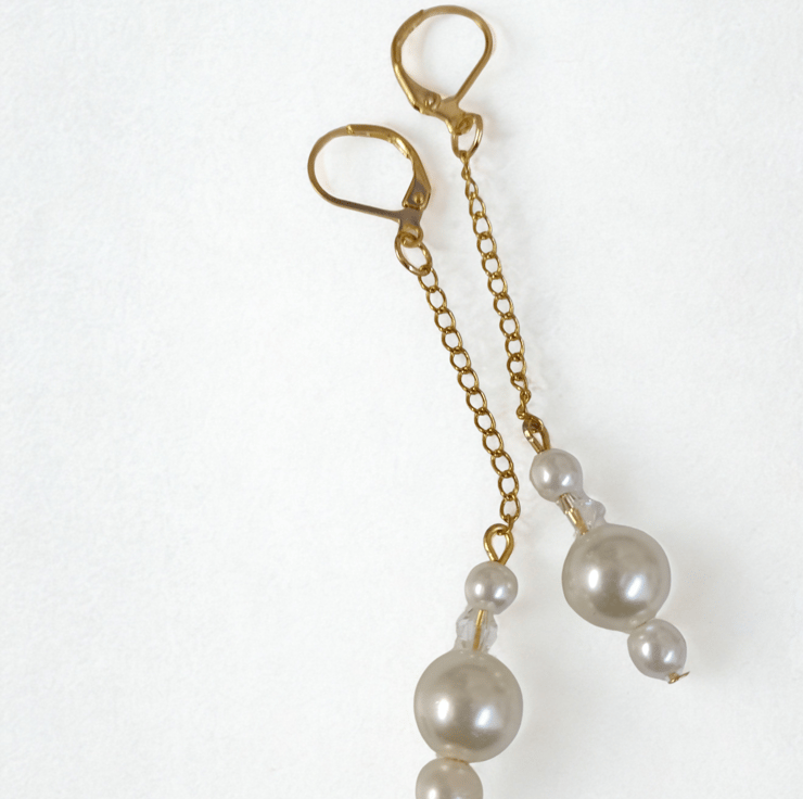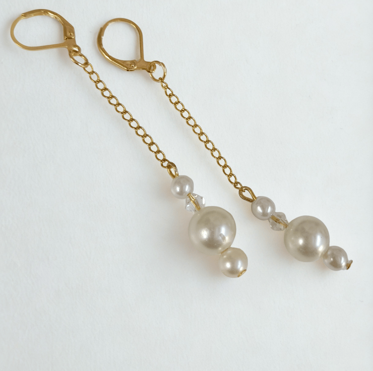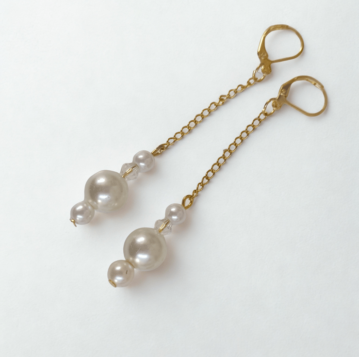 Elegant earrings handmade for a bride for her wedding day. Unique, just one pair like these made. Recycled vintage pearls and a tiny glass beads hanging on very light gold plated chain. On 24 carat gold plated lever back hooks.