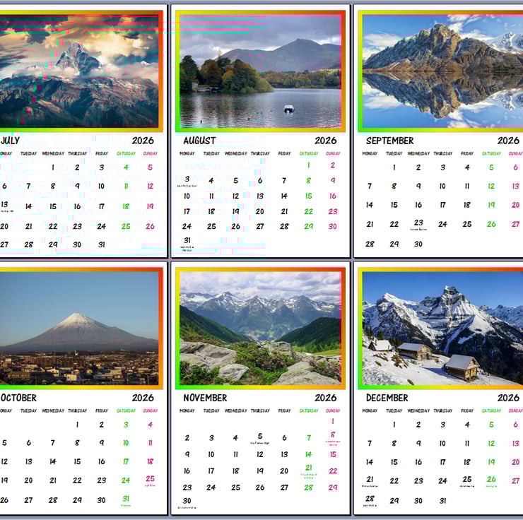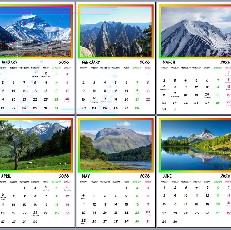 2026 World Mountains Hanging Wall Calendar Each month A4