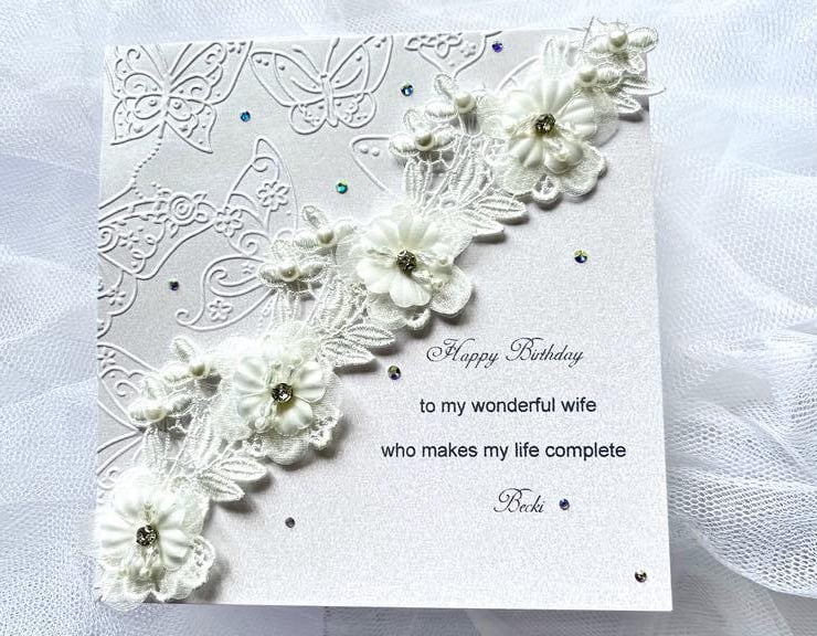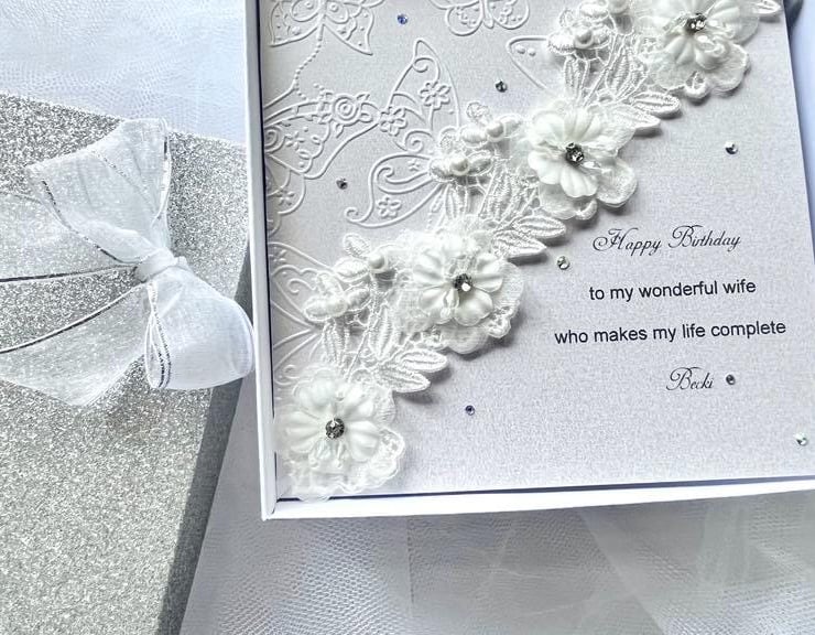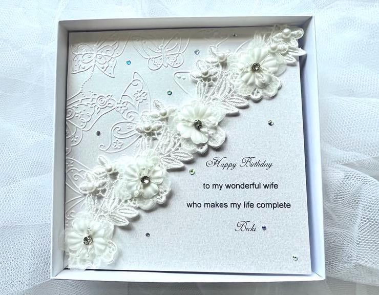 This lovely 3D birthday card is made with beautiful lace flowers. This original gift is unique and will be pleasant for anyone. Due to the 100% handmade products, you may receive vary slightly from the product. Viewing on your computer monitor may appear different than the actual colour of the products.