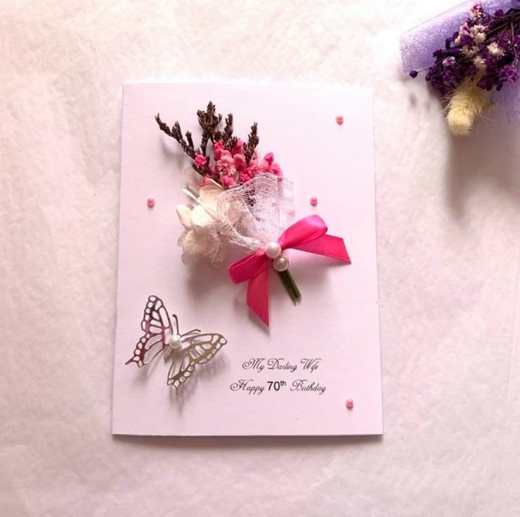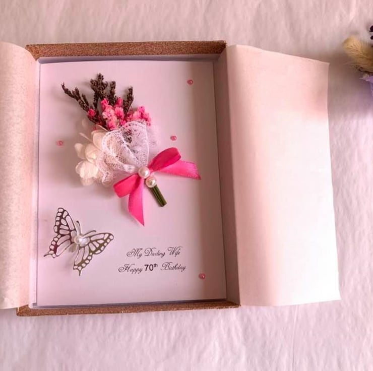 This lovely 3D Card made with preserved flowers. They are 100% natural and unique. They may be kept for 1-2 years. This original gift is designed by us, it is unique and will be pleasant for anyone. Due to the 100% handmade products, you may receive vary slightly from the product.