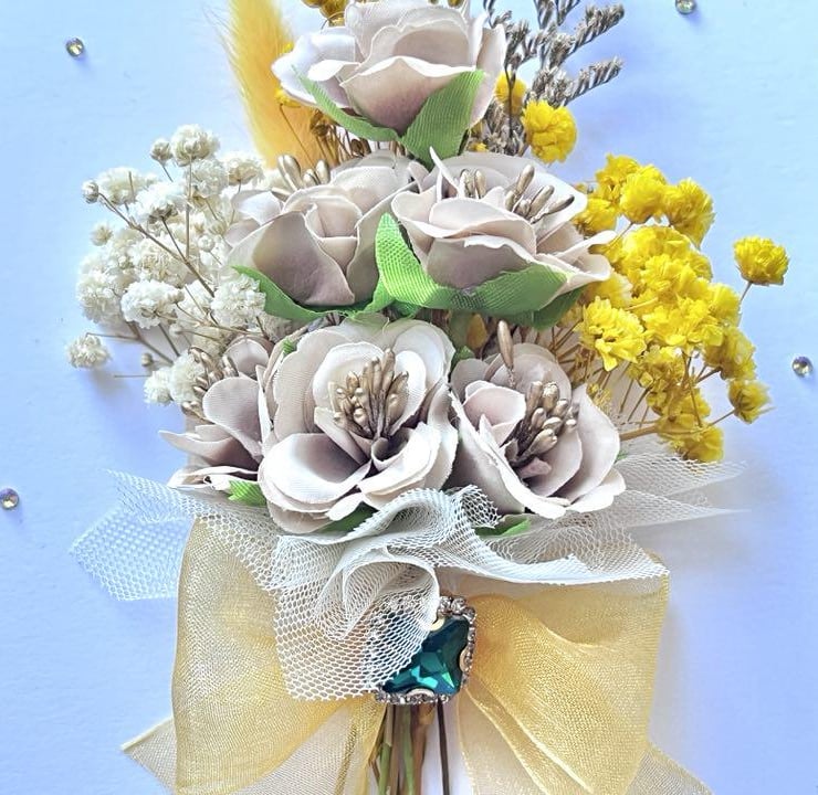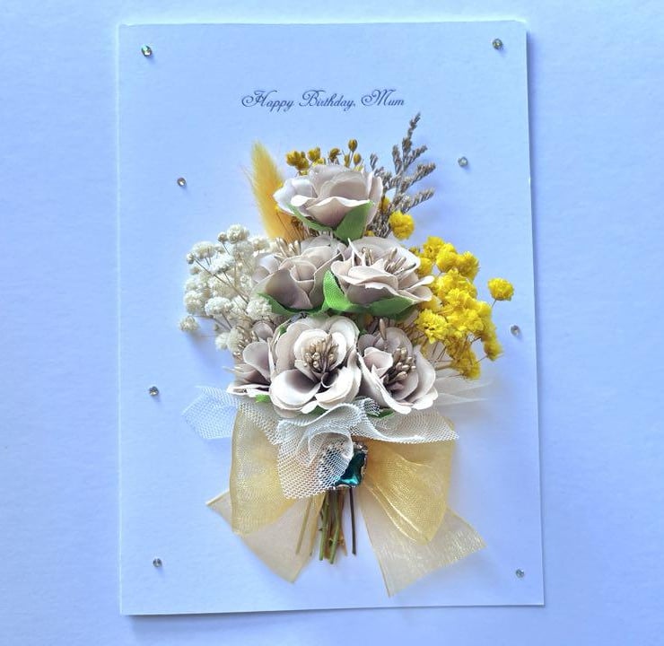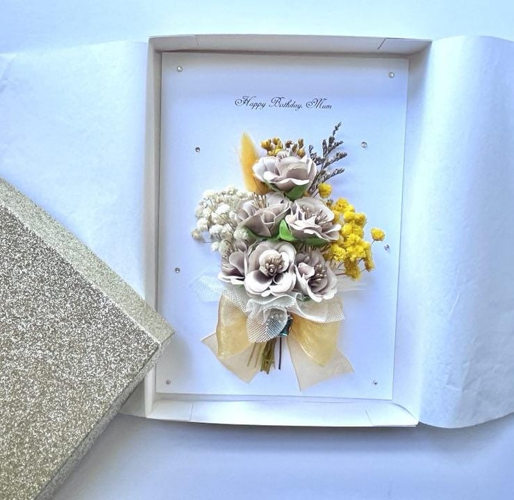 This lovely 3D Card made with artifcial flowers and preserved flowers. Preserved flowers are 100% natural and unique. They may be kept for 1-2 years. This original gift is designed by us, it is unique and will be pleasant for anyone. Due to the 100% handmade products, you may receive vary slightly from the product.