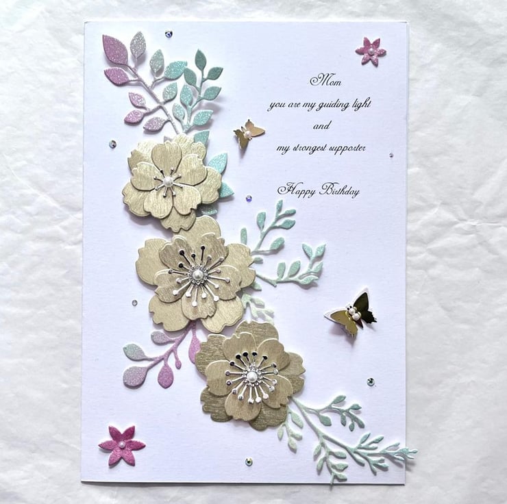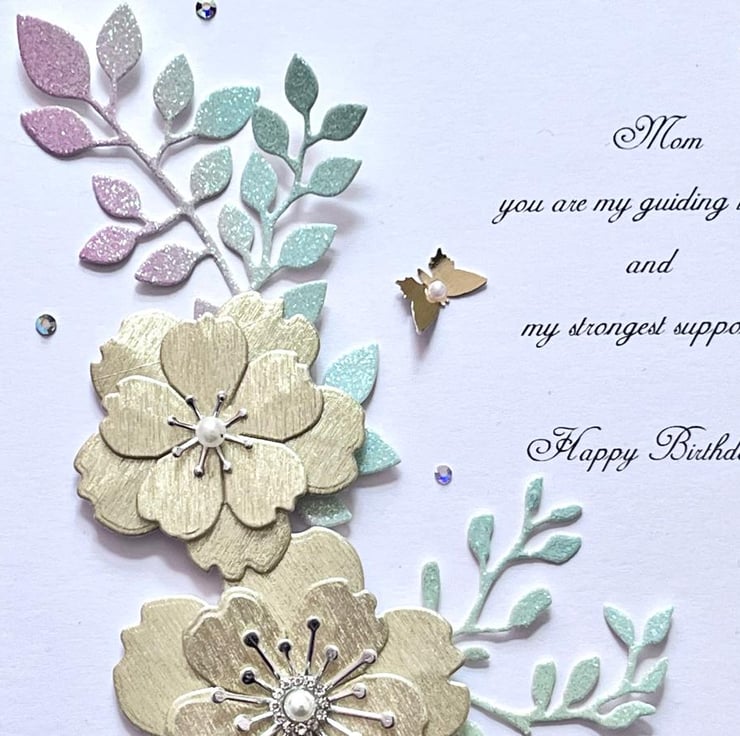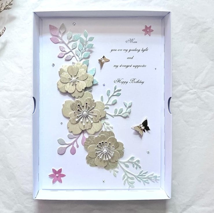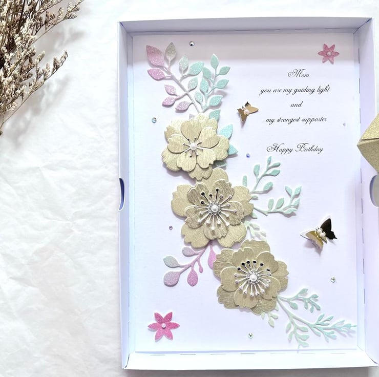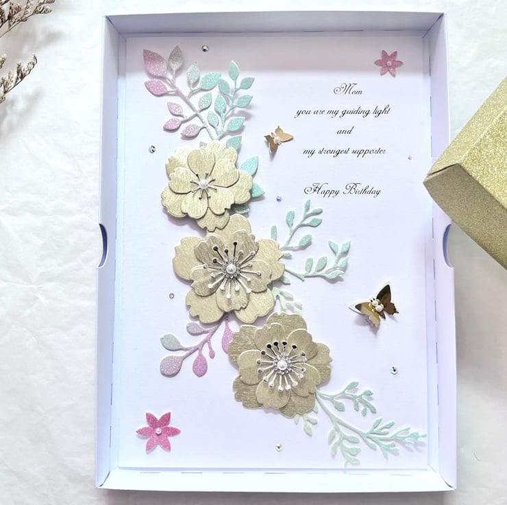 This lovely luxury birthday card with quality shimmer card stocks. It is unique and will be pleasant for anyone. Due to the 100% handmade products, you may receive vary slightly from the product. Viewing on your computer monitor may appear different than the actual colour of the products.