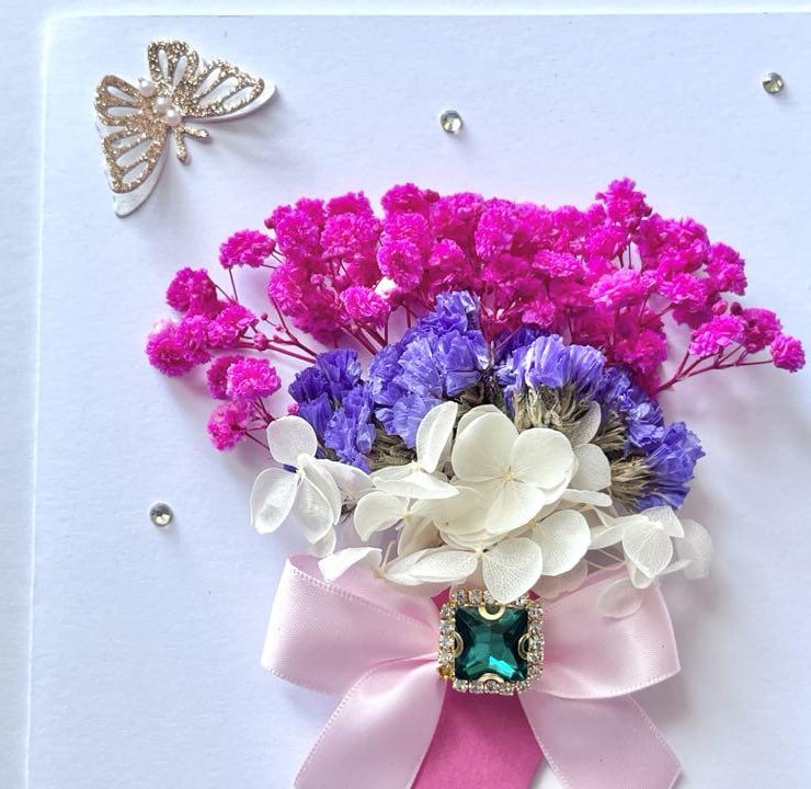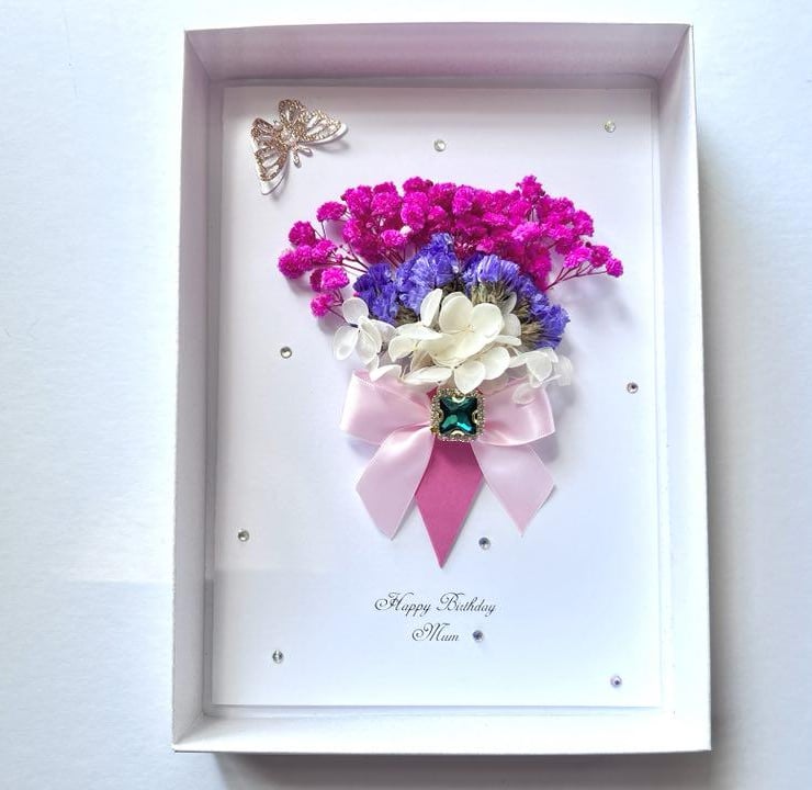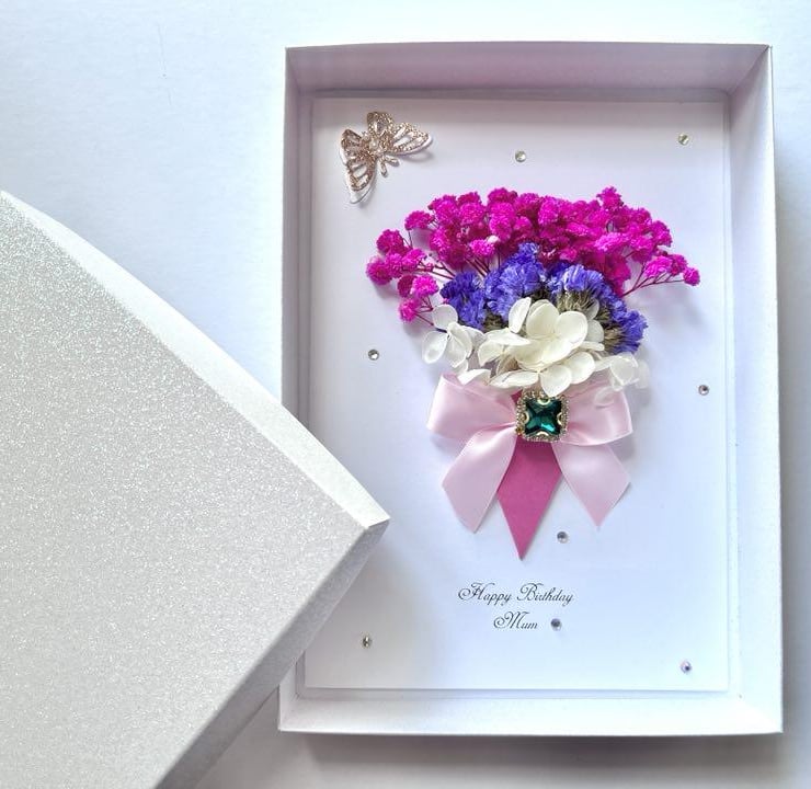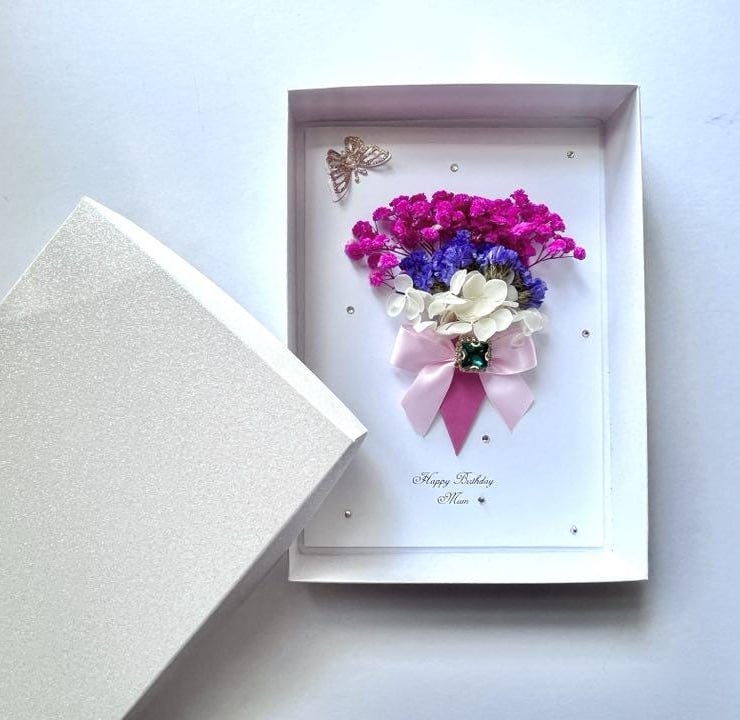 This lovely 3D Card made with artifcial flowers and preserved flowers. Preserved flowers are 100% natural and unique. They may be kept for 1-2 years. This original gift is designed by us, it is unique and will be pleasant for anyone. Due to the 100% handmade products, you may receive vary slightly from the product.