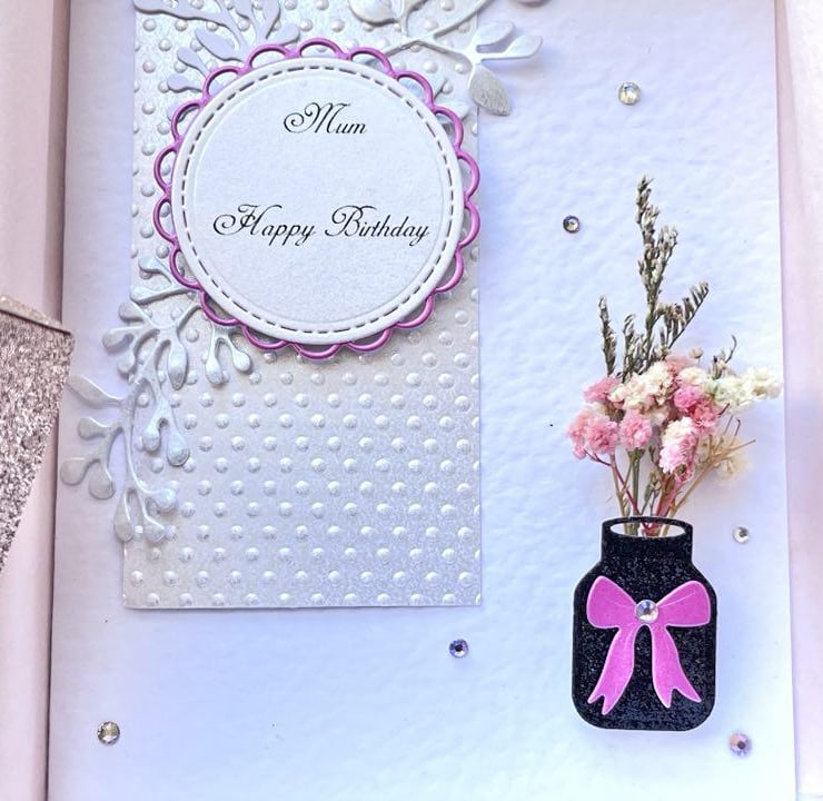 Material: Dried flowers, hammered card, pearlescent card, glitter card,