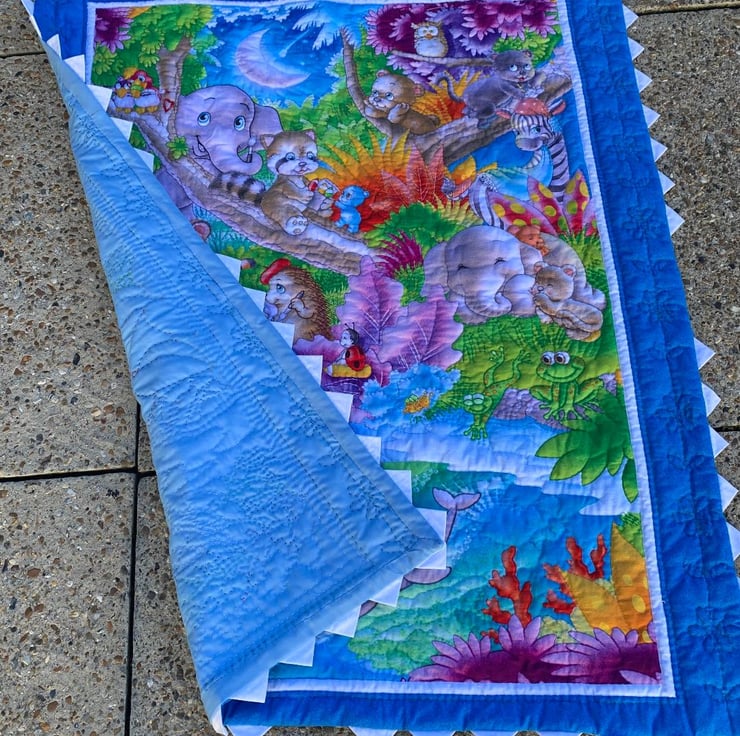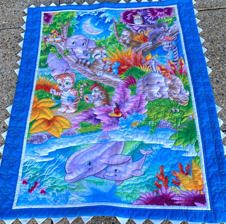 This is a very colourful printed panel of jungle animals and 2 dolphines that I have hand quilted throughout.The backing is a very soft blue cotton fabric. I have edged it with white prairie points to finish it off.