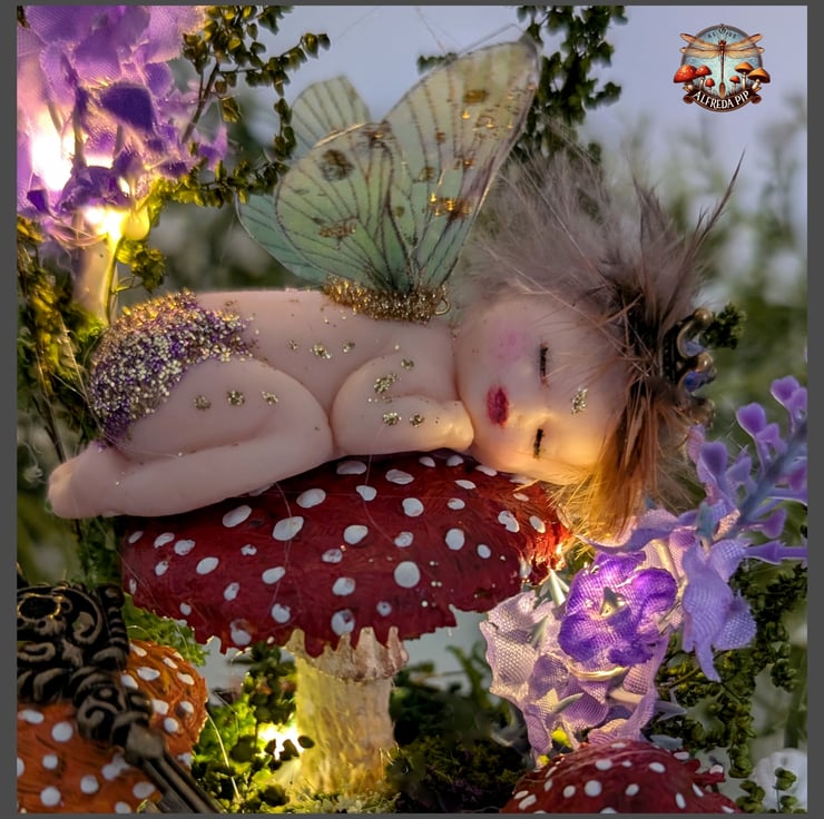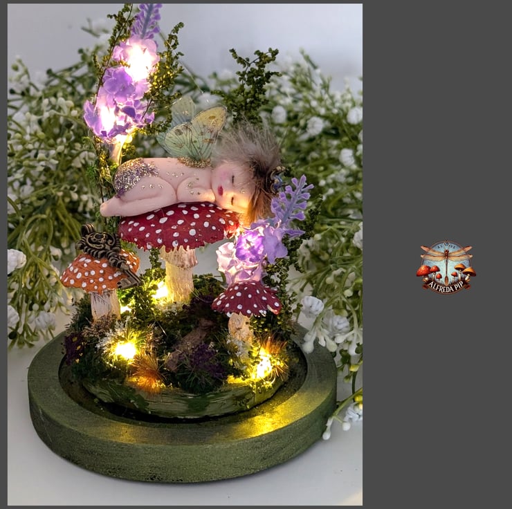 This magical scene shows Rosehip the little Fairy of the Fantasy Forest fast asleep amongst the Toadstools. This also has lights discreetly hidden. Surrounded by moss and faux grasses this makes a magical scene. All parts have been hand painted