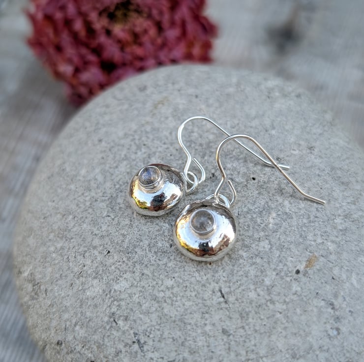 These Silver Pebble Earrings with Labradorite are handmade from recycled sterling silver. Each earring has a rounded pebble-like shape, polished to a bright finish that reflects the light. At the centre sits a small labradorite stone, which catches flashes of colour when it moves. Lightweight and easy to wear with simple hook fittings, they make a lovely everyday pair with a subtle touch of shimmer.
