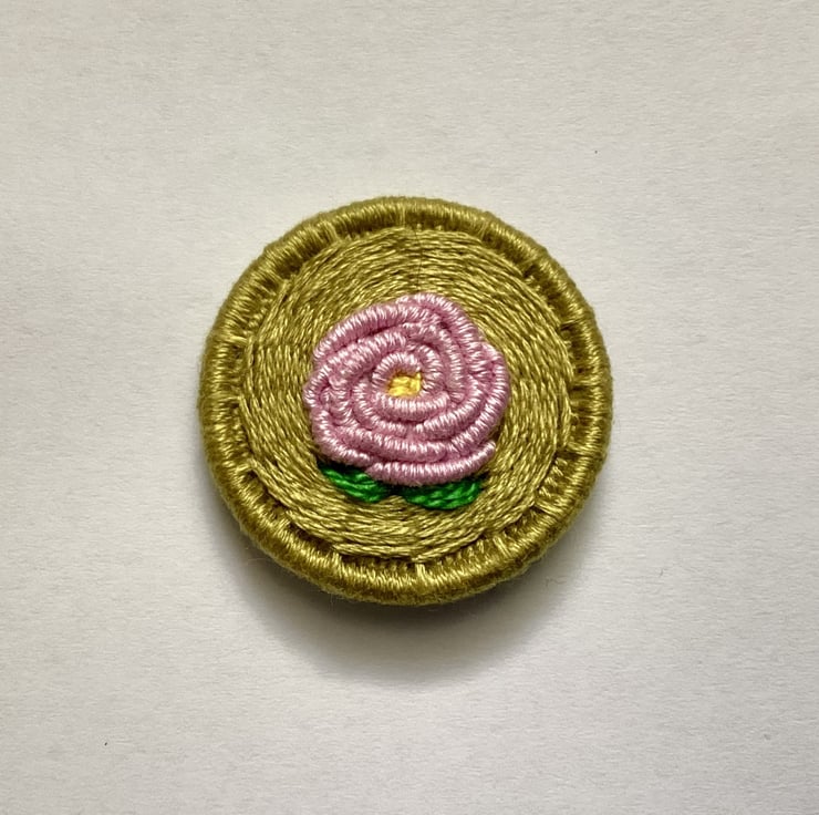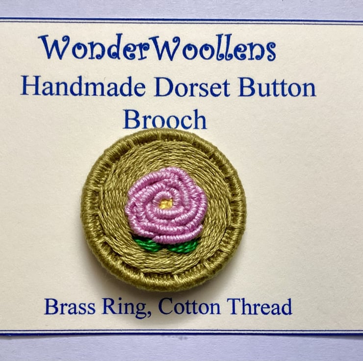 This listing is for a 3.4cm Dorset button brooch or pin. I made this by using various techniques of working cotton thread around a brass ring, forming a pink rose. There are also two green leaves. This is all set on a green background. I have attached a silver plated brooch back for easy attachment to clothing, bags etc.
