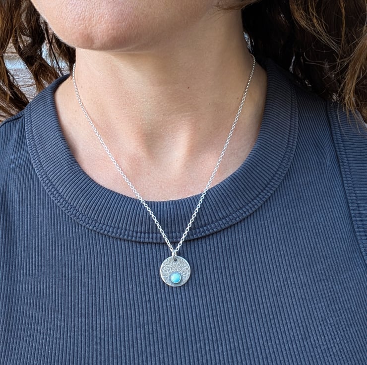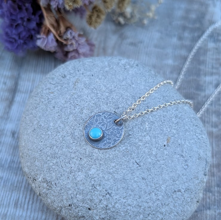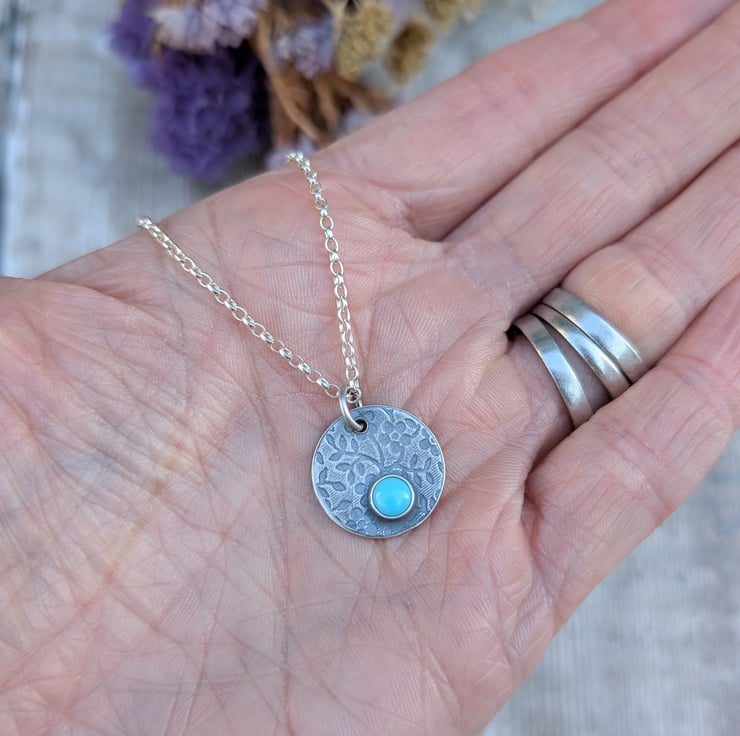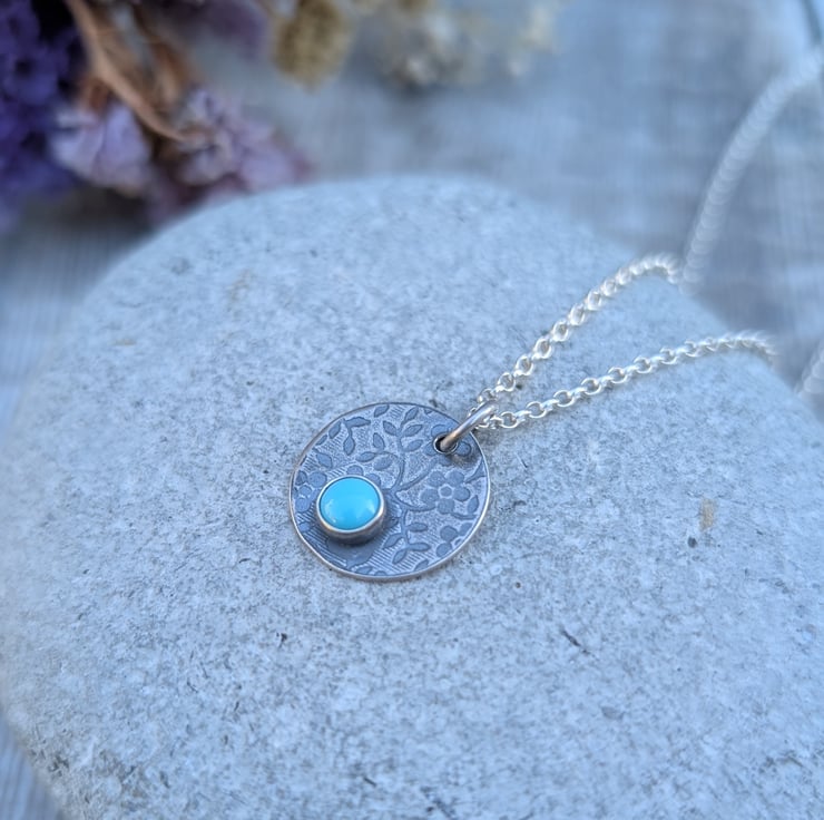 This Silver Floral Disc Necklace with Turquoise is handmade from recycled sterling silver. The silver disc is decorated with a soft floral pattern and finished with a dark oxidised surface that highlights the details. A bright turquoise stone sits at the centre, bringing a pop of colour against the darker silver. The pendant hangs from a simple, shiny silver chain, giving the necklace a lovely balance of texture and contrast. Easy to wear every day, it’s also a thoughtful gift for someone who loves unique gemstone jewellery.