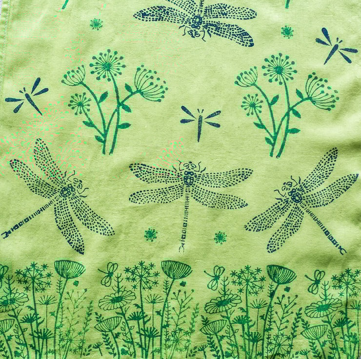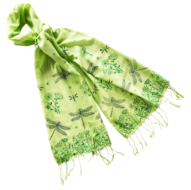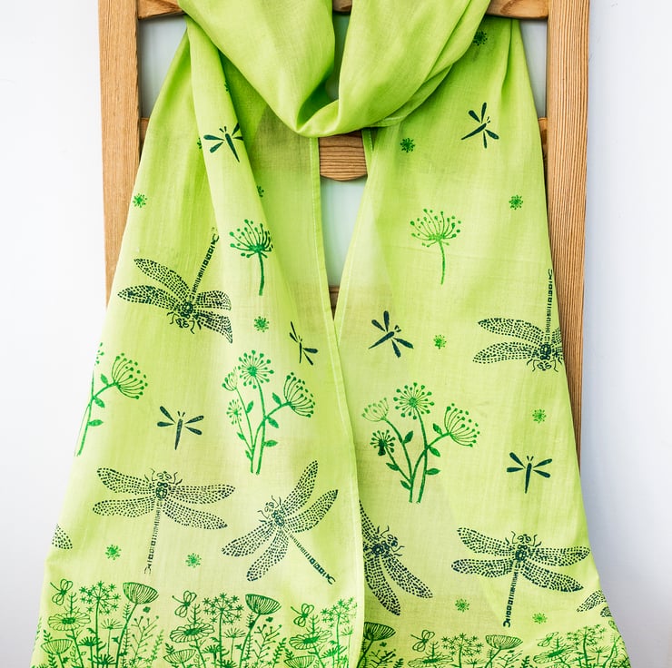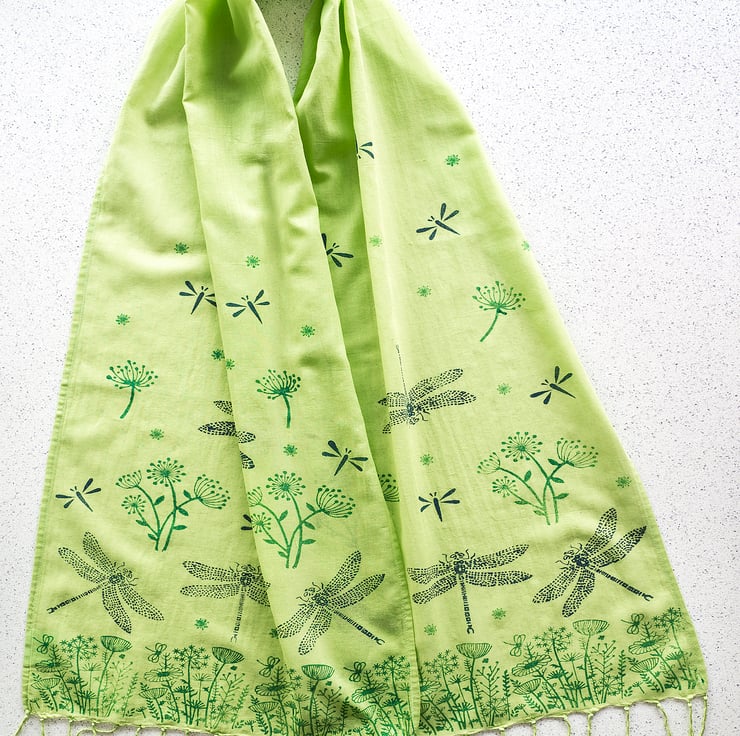 This beautiful organic cotton scarf has been dyed a bright lime green or apple green and then block printed by hand to create a unique design depicting dragonflies with a border of wild flowers and grasses. The background colour is a bright lime green, the insects are navy blue and the borders are an emerald green. All printed using non-toxic fabric paint.