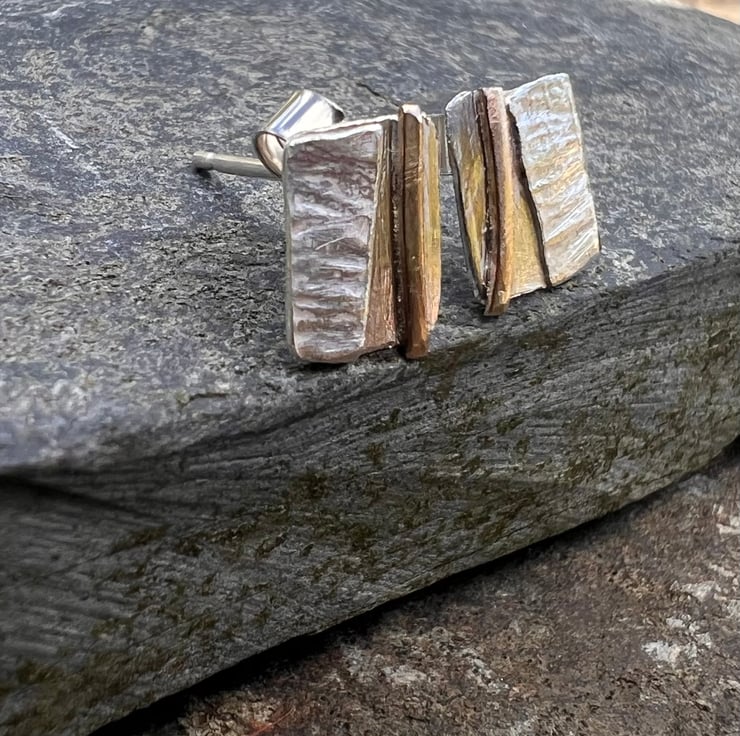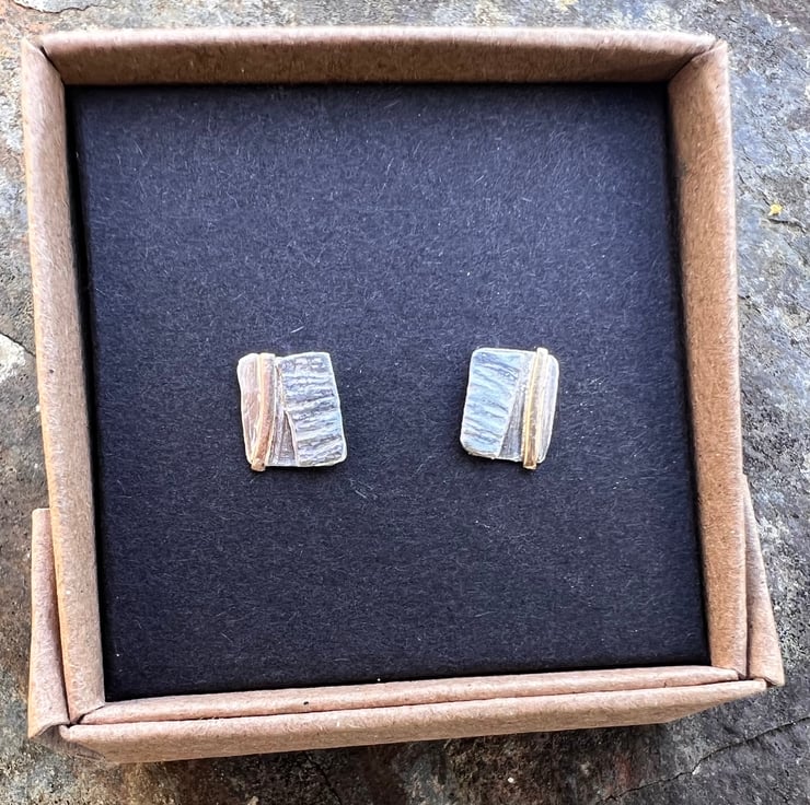 Silver stud earrings inspired by coastline strata. The decorative textures are created with a hammered silver piece and a strip of gold filled wire, which is more durable than gold plated wire .