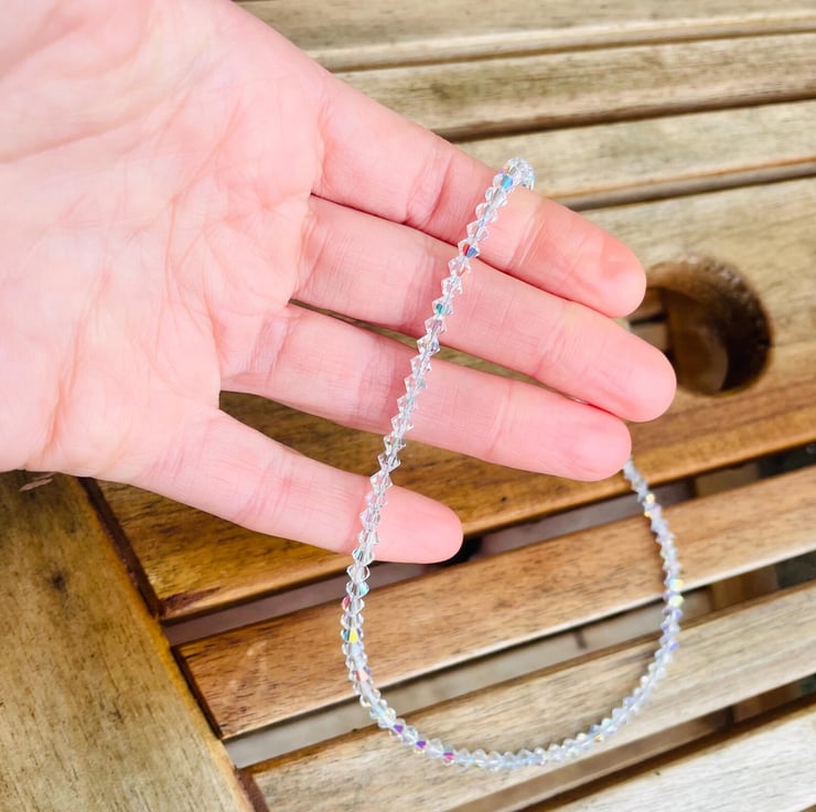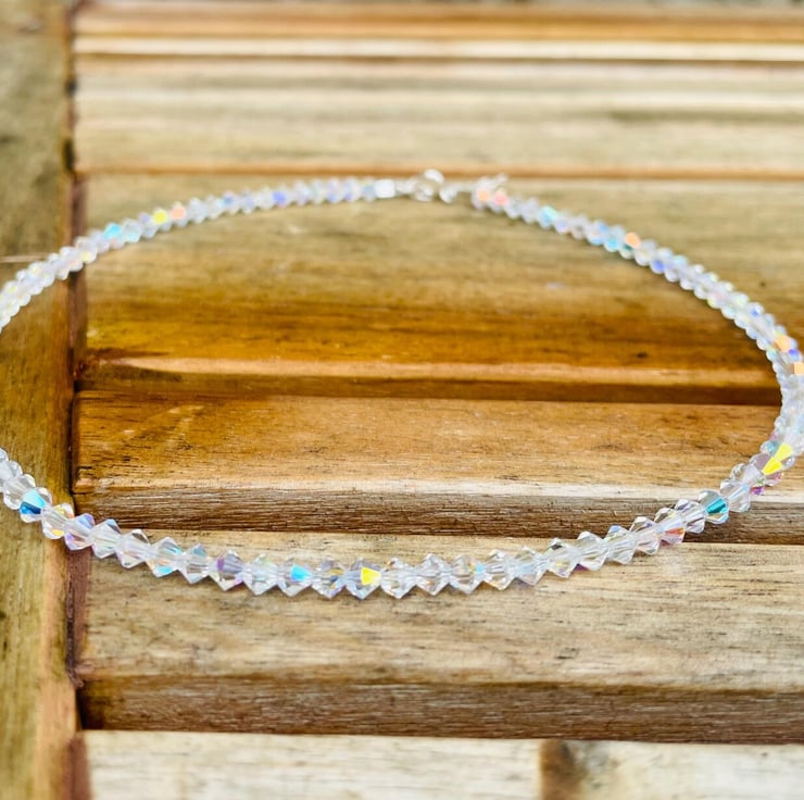 Perfect for the upcoming festive season. Sparkling 3mm clear ab Swarovski crystals choker necklace with sterling silver clasp and 1.5 inch sterling silver hearts extension chain. The necklace measures 14 inches with a further extra 1.5 inch extension chain so it can be worn up to 15.5 inches at the last fastening, free gift box tied with ribbon, we can make up a multiple order of this piece so please ask.
