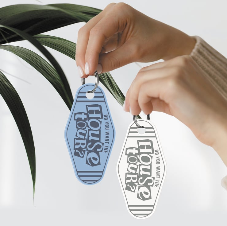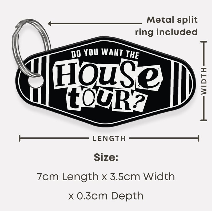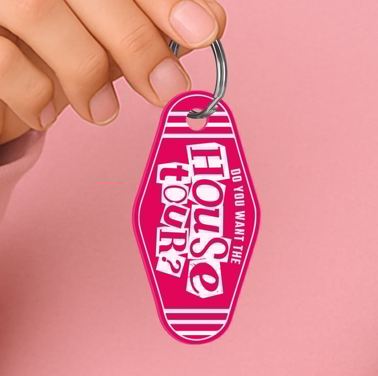 Make your keys stand out with this bold cut-out text acrylic keyring. Featuring the playful phrase Do You Want the House Tour?, this design is perfect for fans who love a touch of humour and music-inspired style. The retro motel shape gives it a nostalgic vibe, while the lightweight acrylic makes it practical for everyday use. Whether you’re treating yourself or looking for a small gift for a fan, this quirky keychain is a fun way to carry a little lyric-inspired joy everywhere you go.