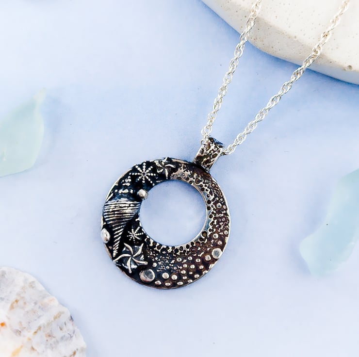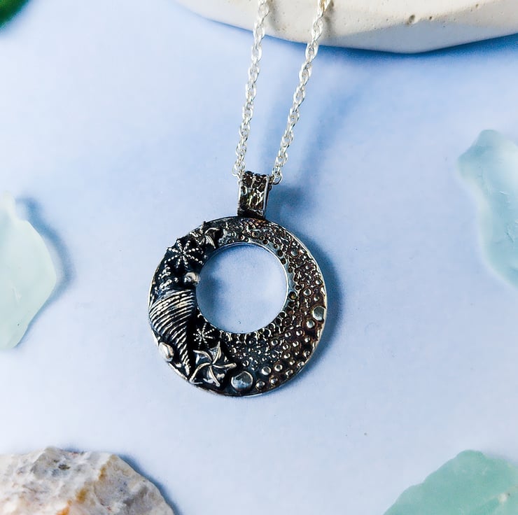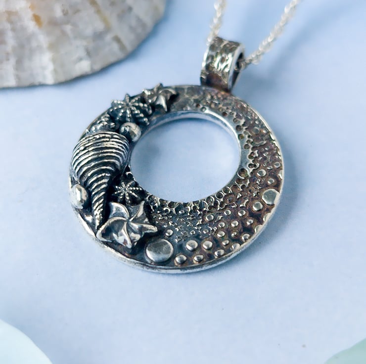 This coastal-inspired rock pool pendant captures the magic of the seaside in intricate detail. Handcrafted from recycled fine silver, which is 99.99% pure, it is adorned with delicate miniature shells, tiny sea anemones, graceful starfish and scattered pebbles. Each detail has been individually created by hand using silver clay, giving the piece a truly one-of-a-kind character. A dark patina has been added to enhance the textures and highlight the depth of the design, echoing the hidden wonders of a rock pool.