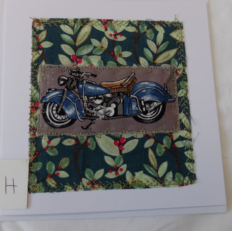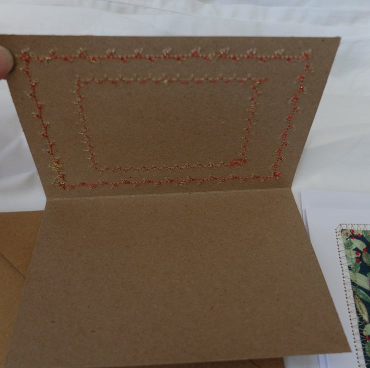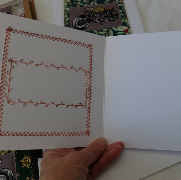 Each motif is appliqued onto a colourful backing design and then all attached to a blank card and embellished with machine embroidery.