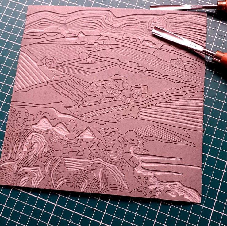 The image shows a landscape of fields and hedgerows rising to a dramatic skyscape. In the foreground a bank that suggests grasses and textures of foliage. The overall design is subtle and abstracted in character.