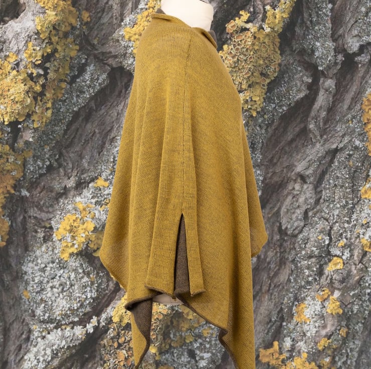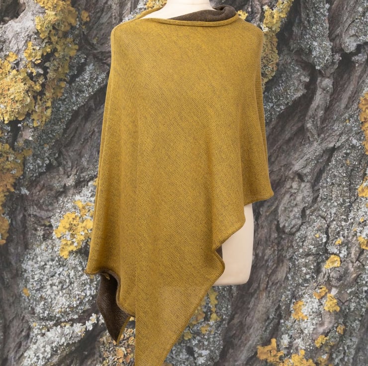 Experience the beauty of nature with the Colours of Nature Merino Reversible Poncho - Lichen. Inspired by the the muted grey colours with a pop of yellow of lichen. This luxurious poncho features silky-soft merino in mustard yellow and a contrasting dark grey. Ideal for year-round wear, its reversible design adds versatility, making it the perfect accessory for any occasion.