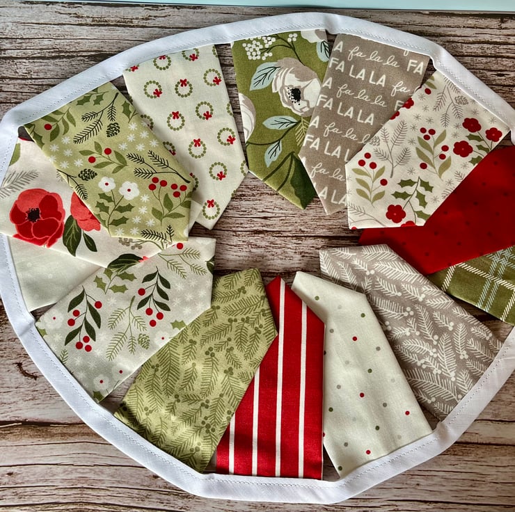 Mini bunting ideal for mantelpiece or office desk. 114cm long with d-rings either end, suitable for hooks. 14 flags each measuring 10cm x 5.5cm. Handmade with gorgeous Christmas theme.