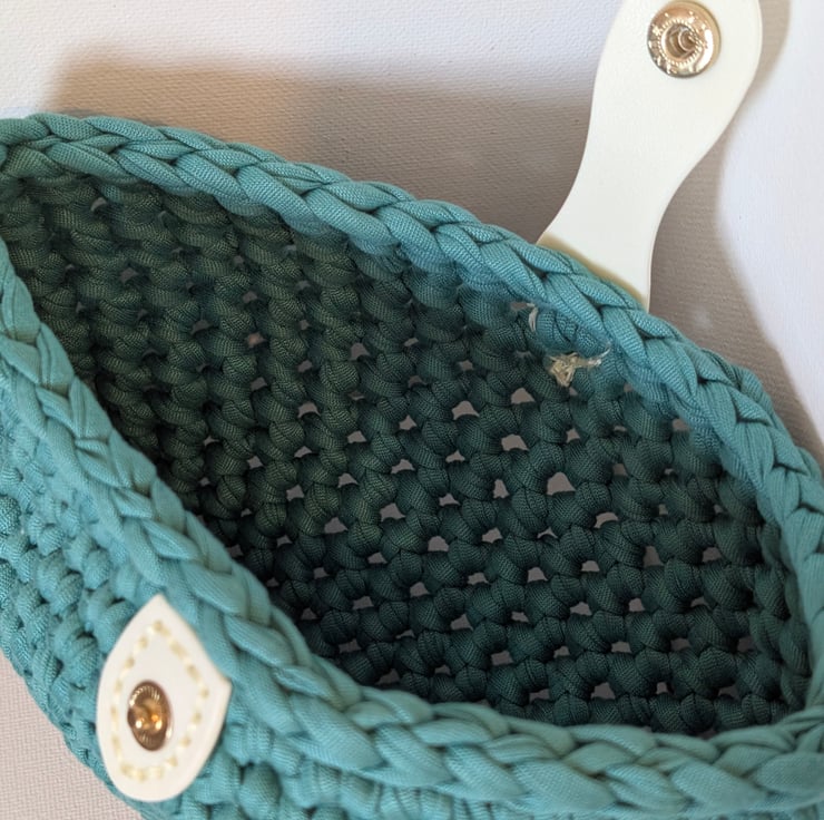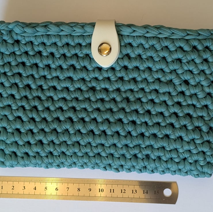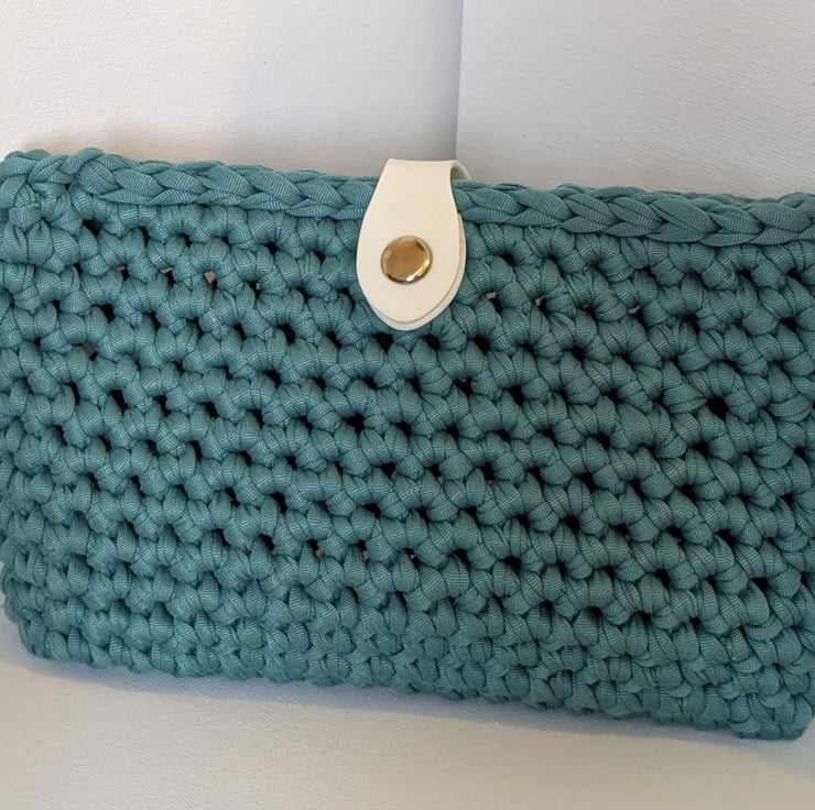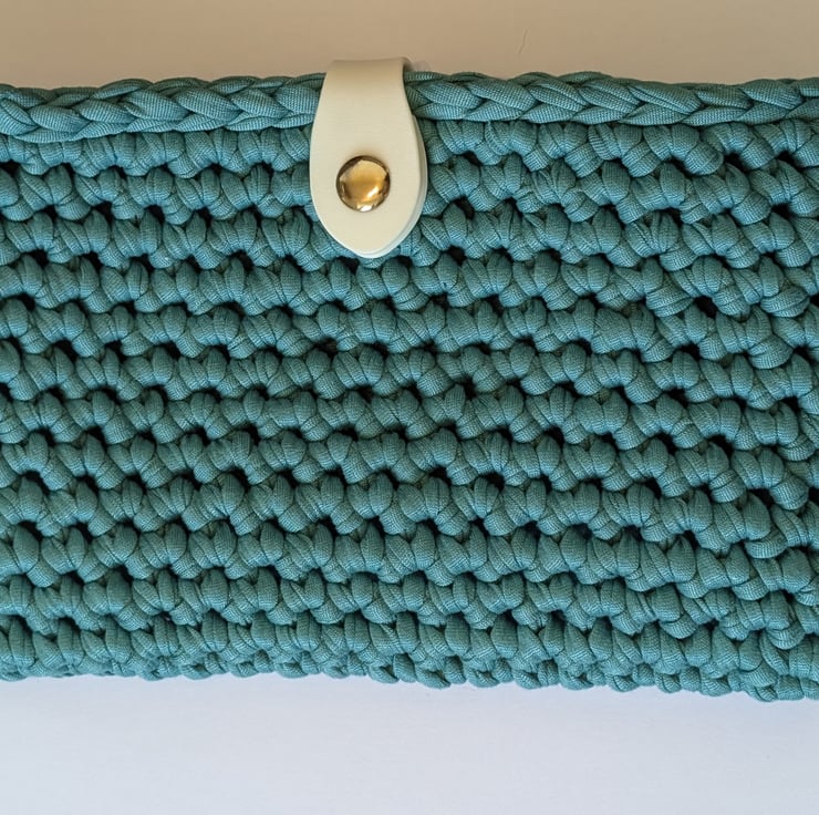 Handmade turquoise colour crochet clutch bag made with t-shirt yarn