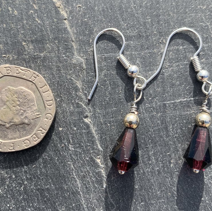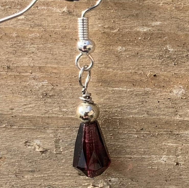 Pretty glass drop beads in magenta, topped with a little spherical bead and silver-plated fishhook wires. The drop is 2cm. One of a kind, handmade. Reimagined, ethical jewellery with planet-friendly packaging.