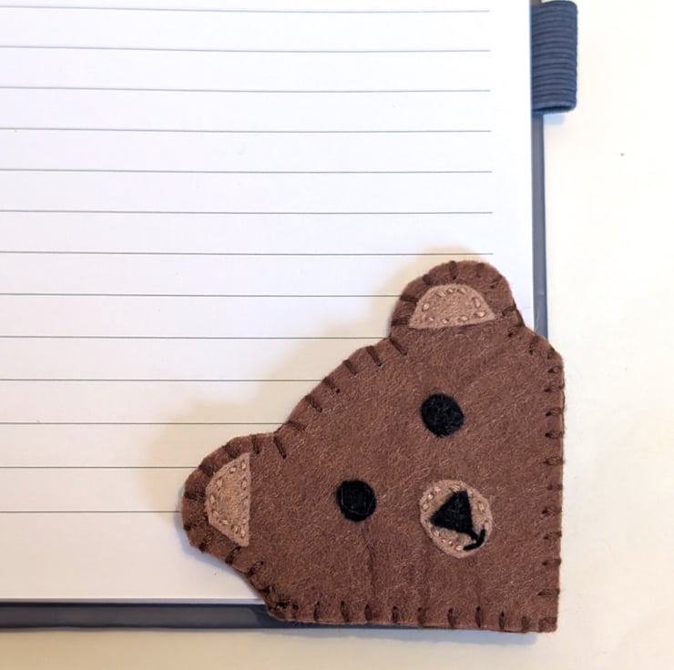 A handmade sewn felt corner bookmark in the shape of a brown bear's head.